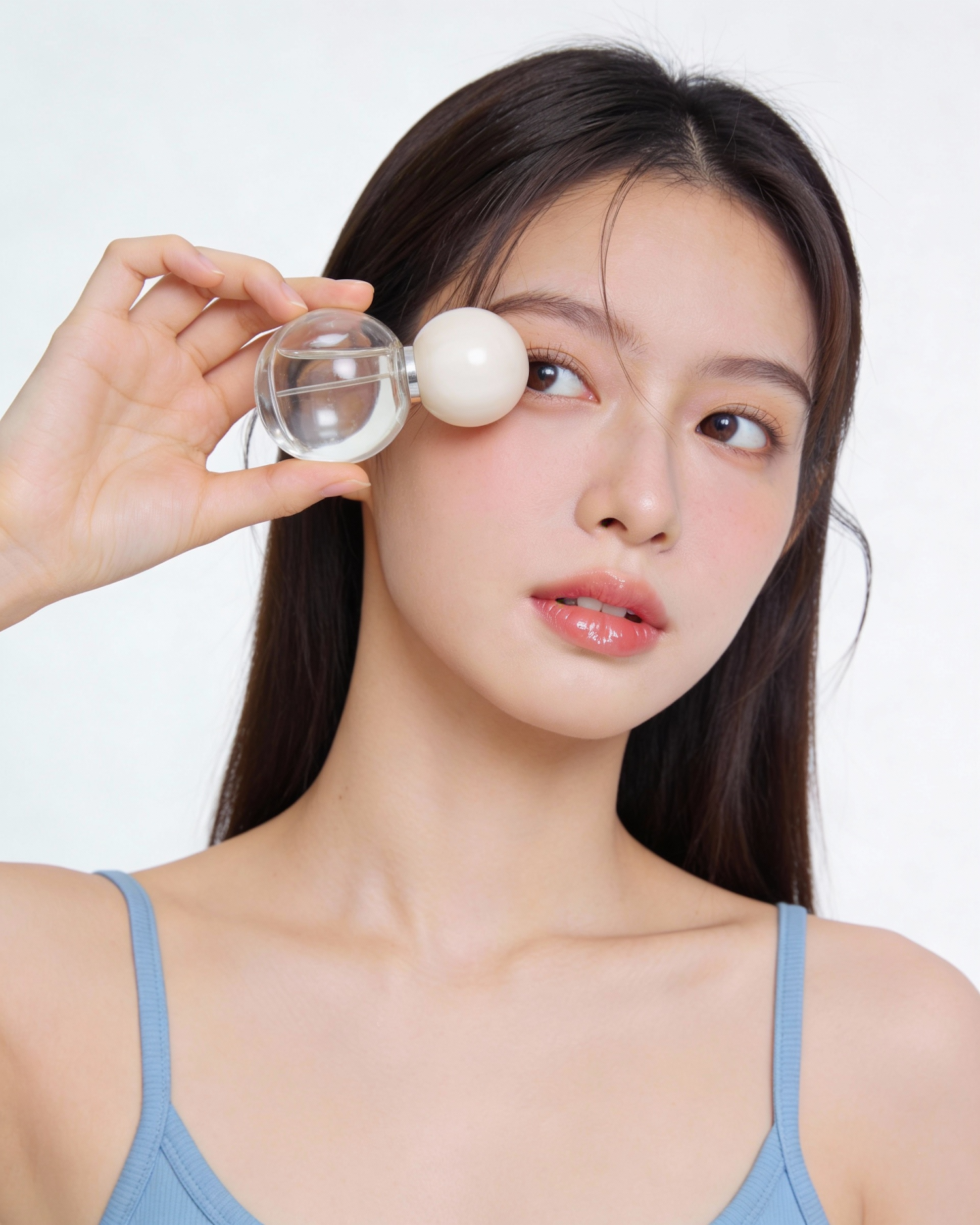 A young woman using a spherical skincare tool near her eye, showcasing a smooth complexion and a calm expression.