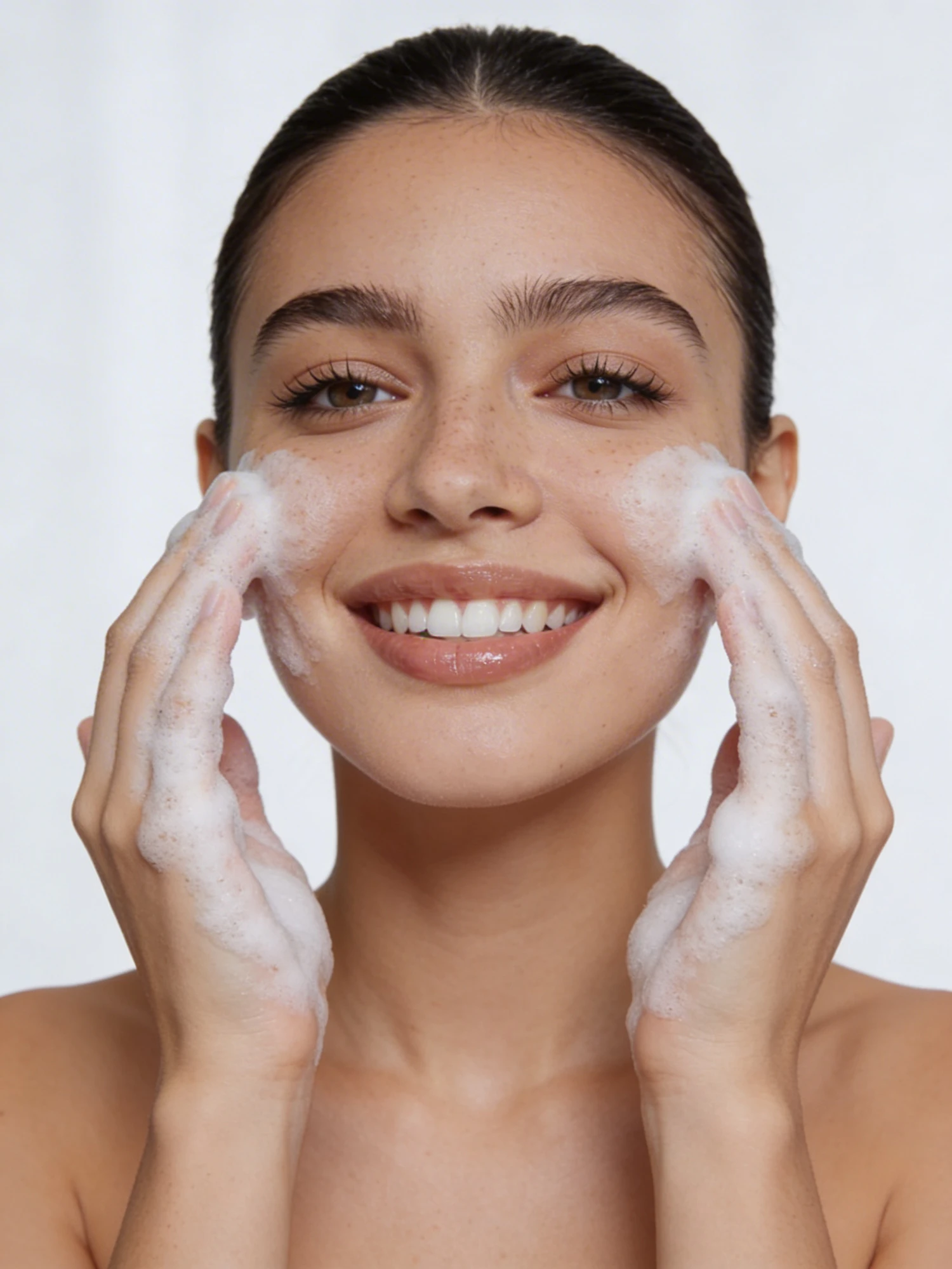 A young woman smiling while applying a foamy cleanser to her face, showcasing a skincare routine in a bright and clean setting.