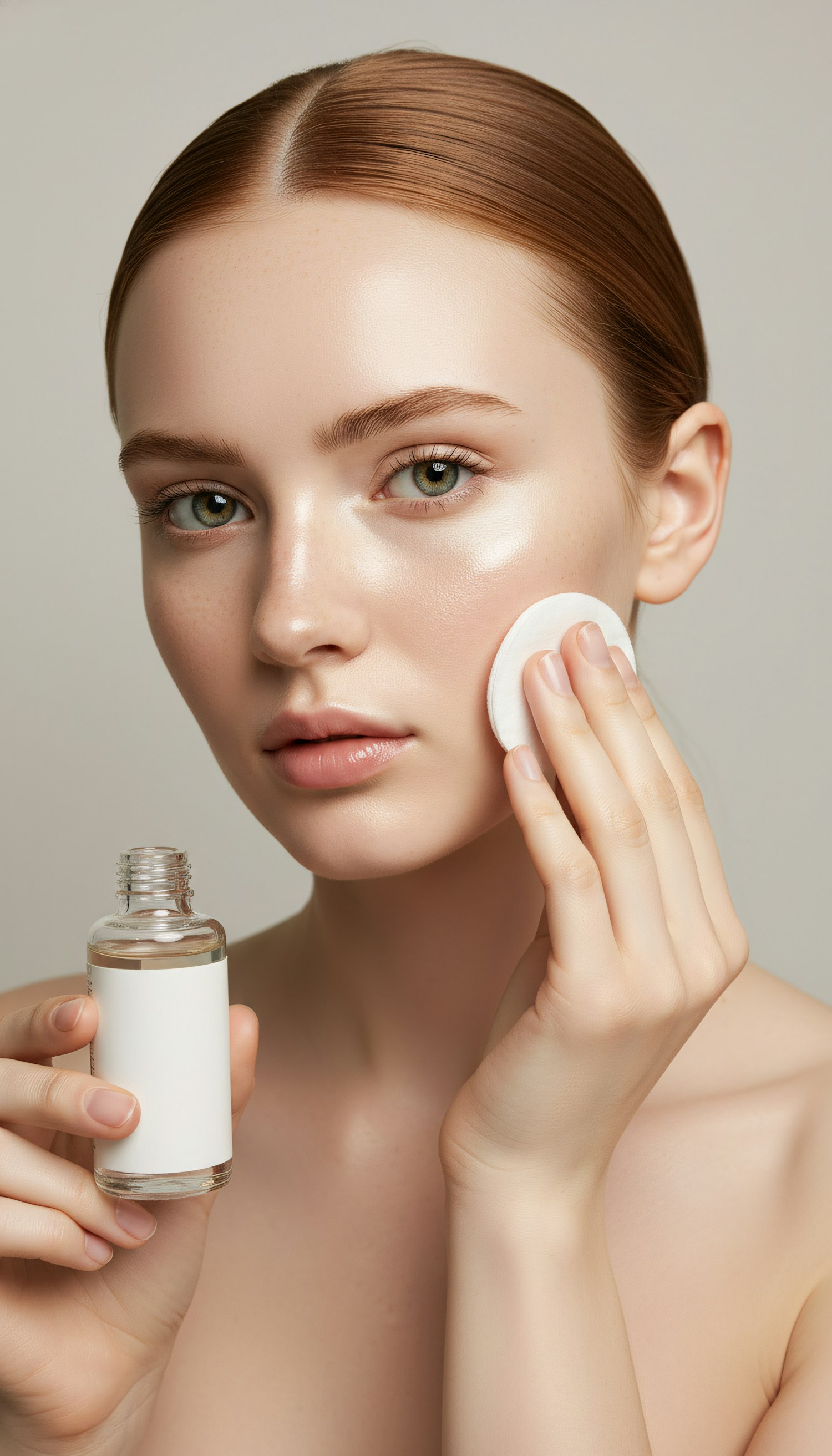 A close-up of a woman applying skincare with a cotton pad and holding a serum bottle, showcasing a radiant and healthy complexion.
