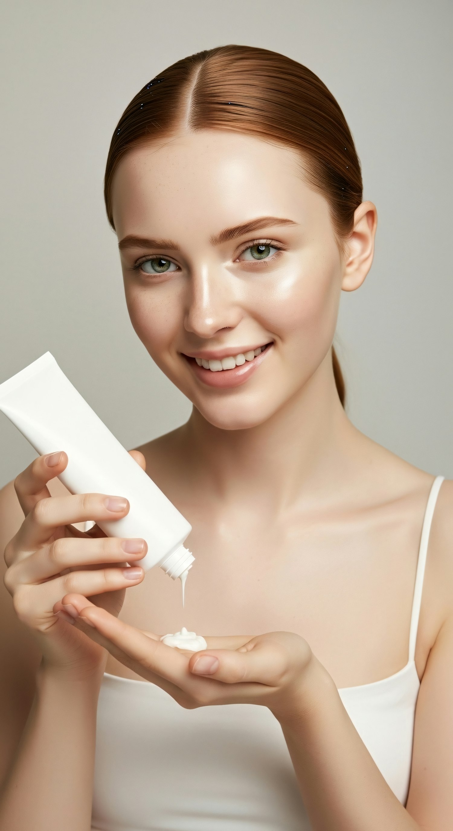 A smiling woman with fair skin and auburn hair applies cream from a white tube, showcasing a skincare routine in a neutral setting.
