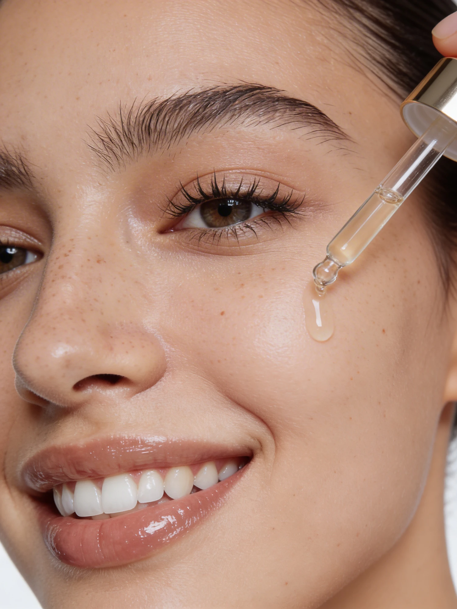 Close-up of a person applying skincare serum with a dropper, showcasing smooth skin, freckles, and a natural glow.