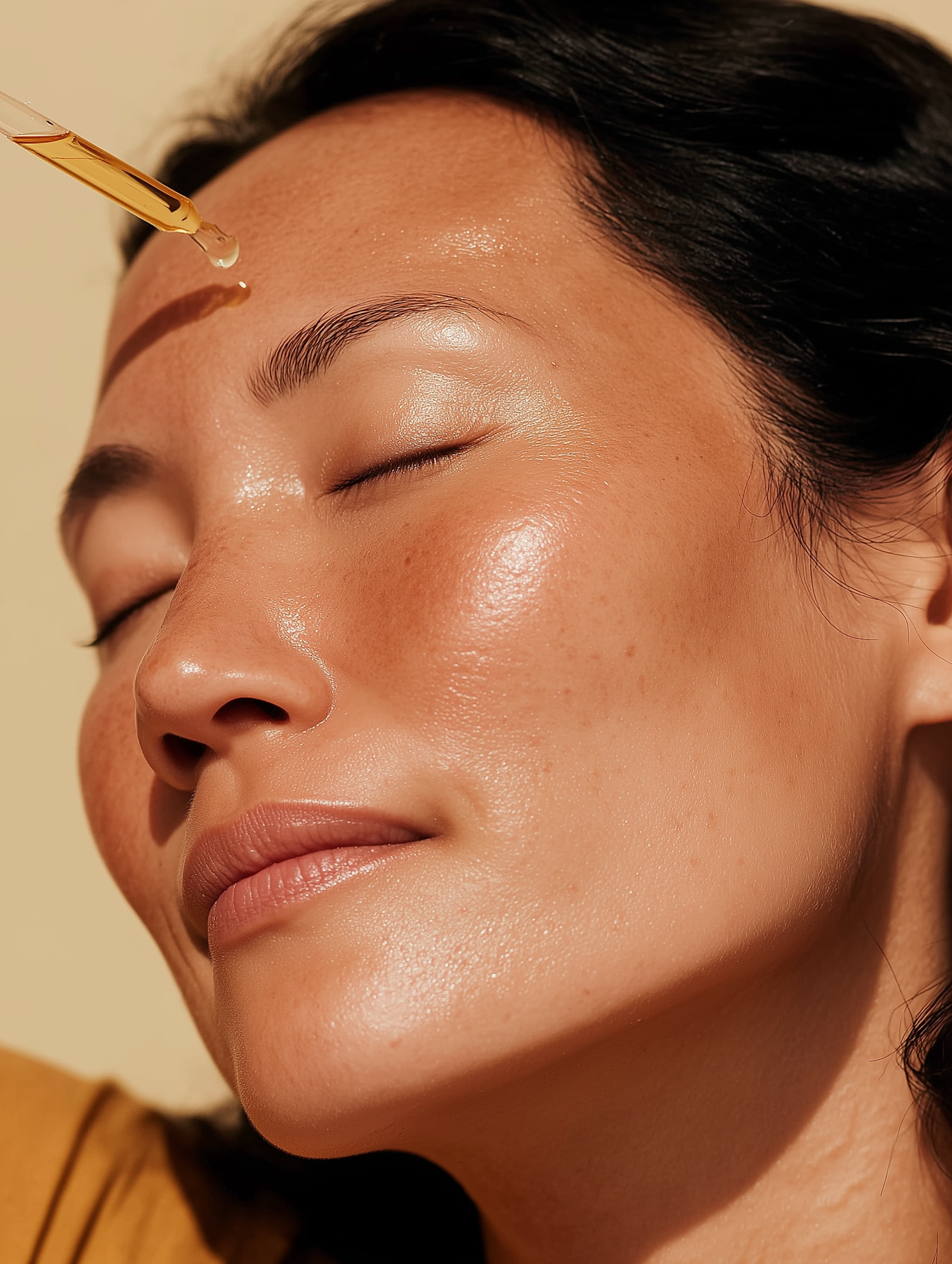 Close-up of a person applying skincare serum to their forehead, showcasing glowing, smooth skin under warm lighting.