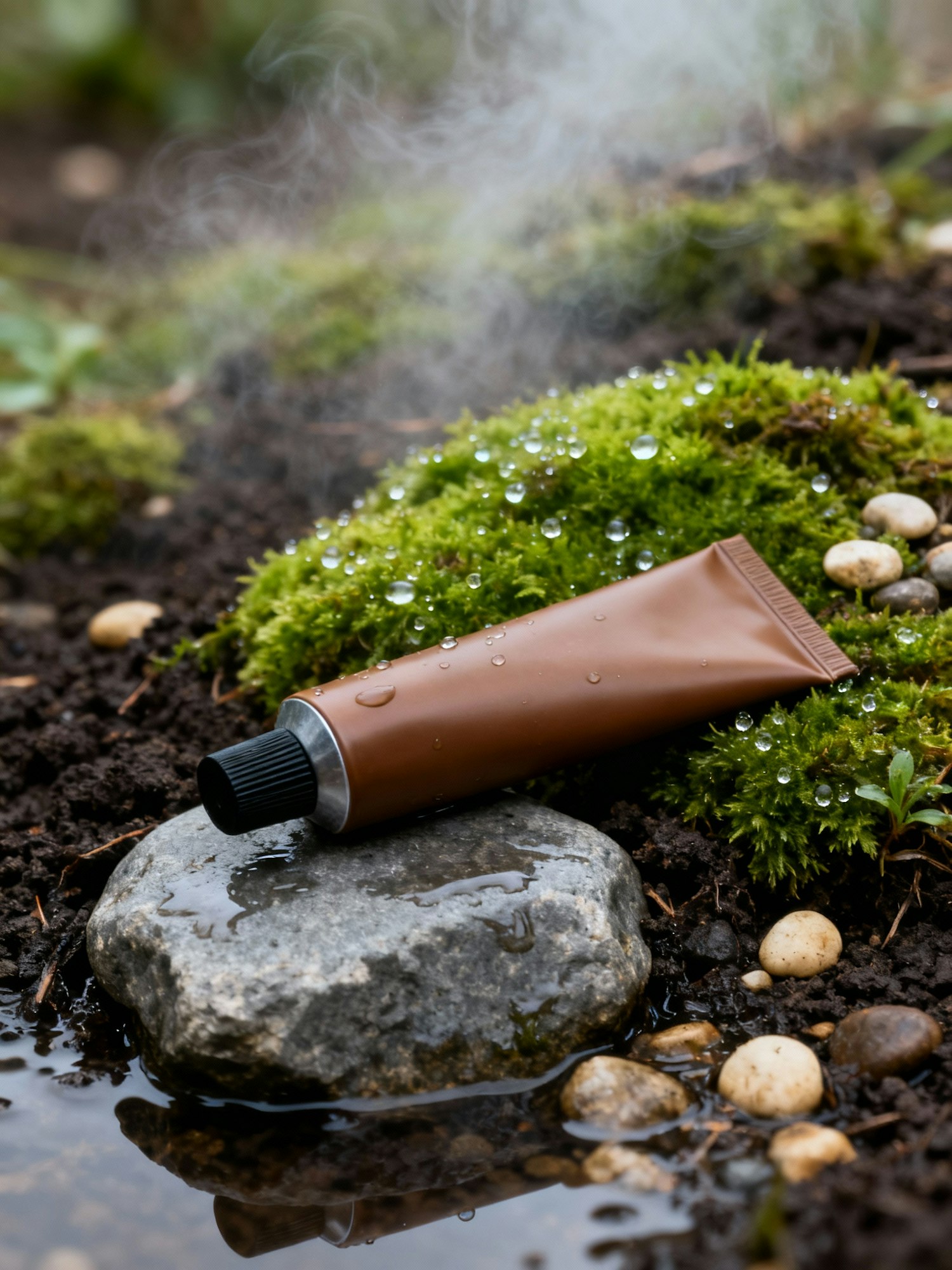Mat brown skincare product with black cap, no label or text, on a natural flatlay surrounded by moss, stones, and wet soil. Light mist in the air and dew droplets on the surface. Soft overcast daylight, cinematic and tactile mood, earthy palette with tones of green, brown, beige, and grey. The product appears slightly embedded in the ground, with subtle water reflections. Detailed realistic textures — moist moss, rough stone, glossy glass or matte surface. Photography inspired by Aesop outdoor campaigns, shallow depth of field, macro realism. → A mat brown skincare tube with a black cap rests diagonally on a rough, grey stone slick with moisture. Small pieces of moss cling to its side as if it had just been placed there after rainfall. Surrounding the stone are tiny pebbles and patches of damp earth. The light is muted, creating a balance of matte surfaces and glossy reflections. The mist softens the horizon, giving the frame a serene, sensory calm.