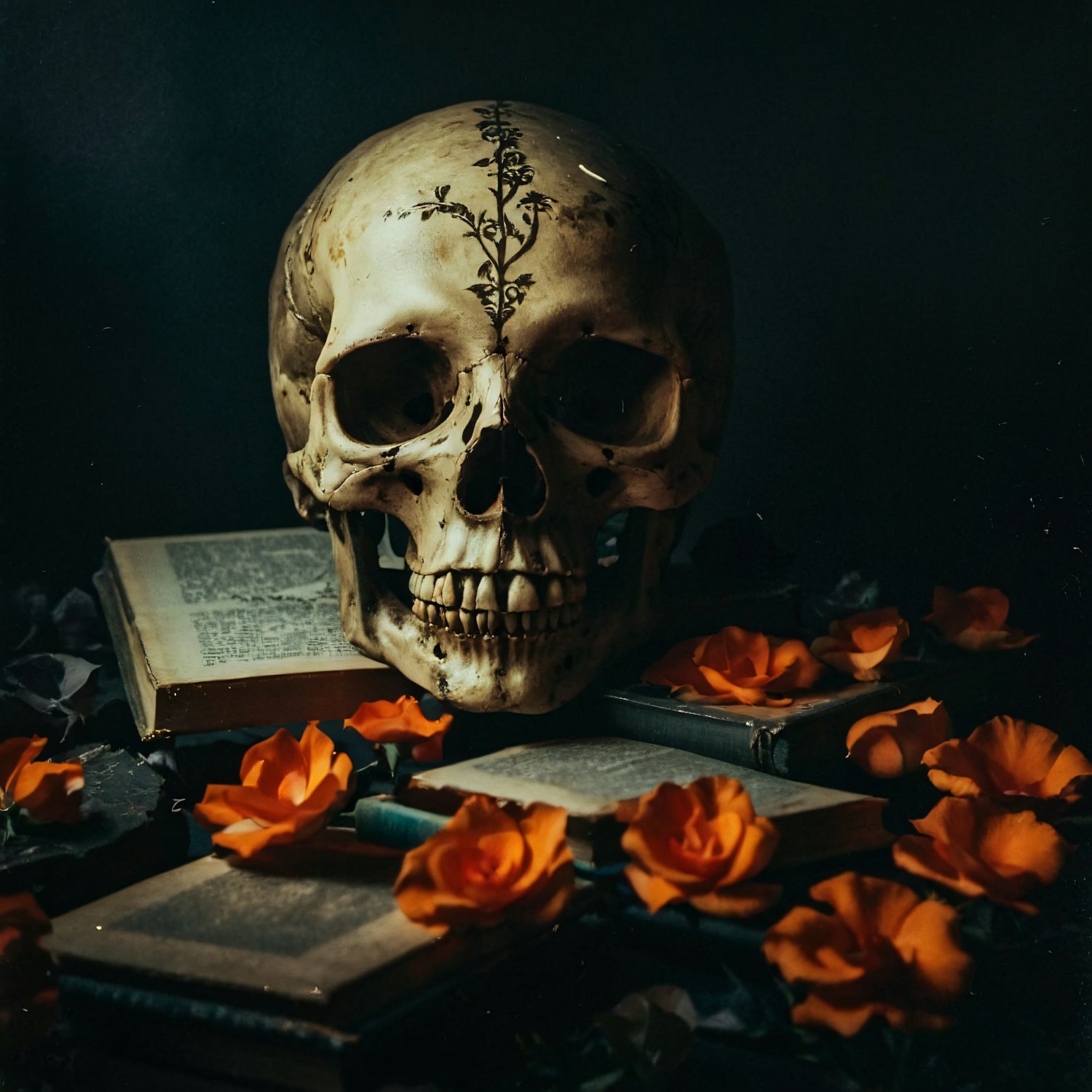 A skull with floral patterns surrounded by books and orange roses, creating a gothic and atmospheric scene.