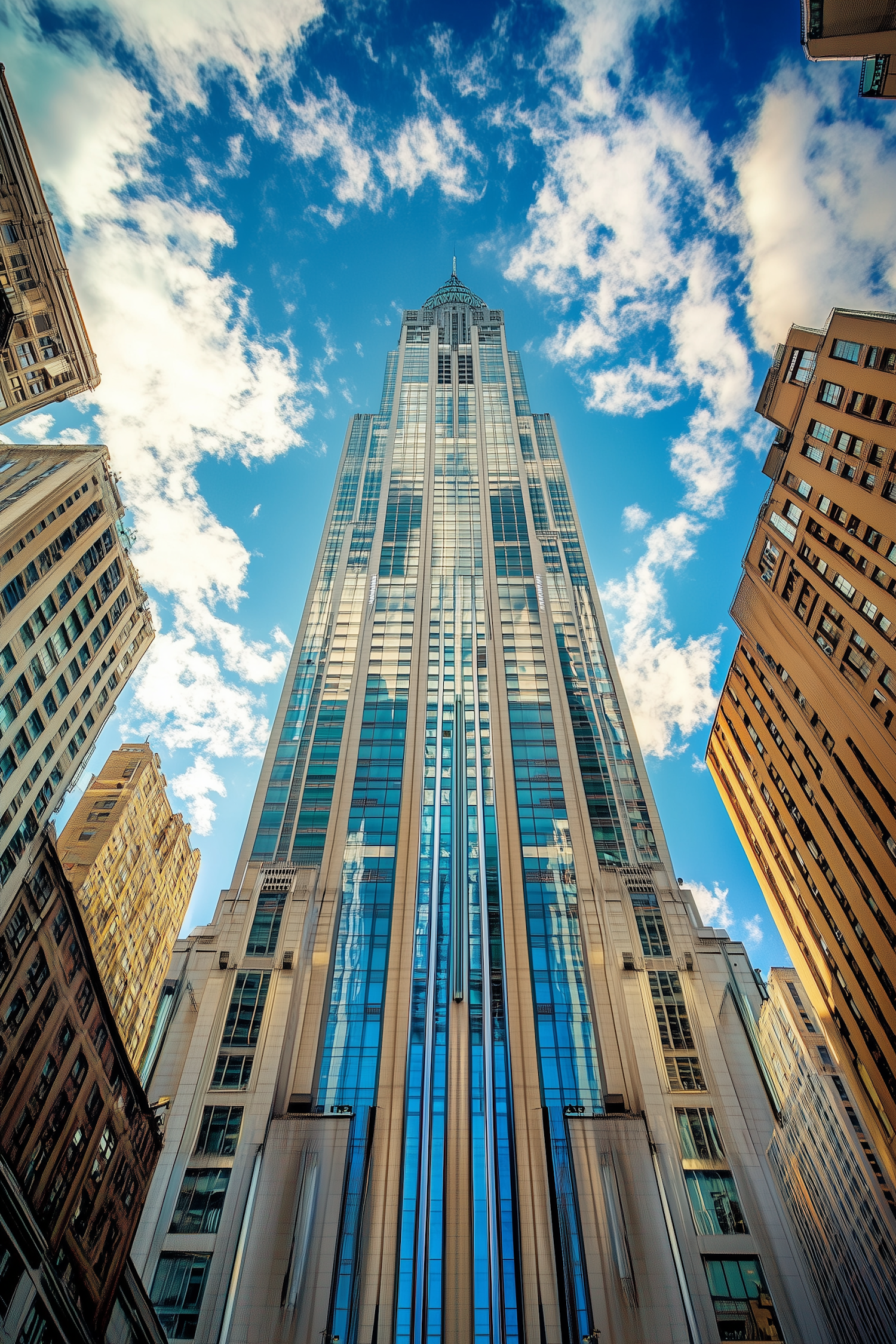 Majestic skyscraper against a blue sky with clouds, surrounded by urban architecture, viewed from a low angle.
