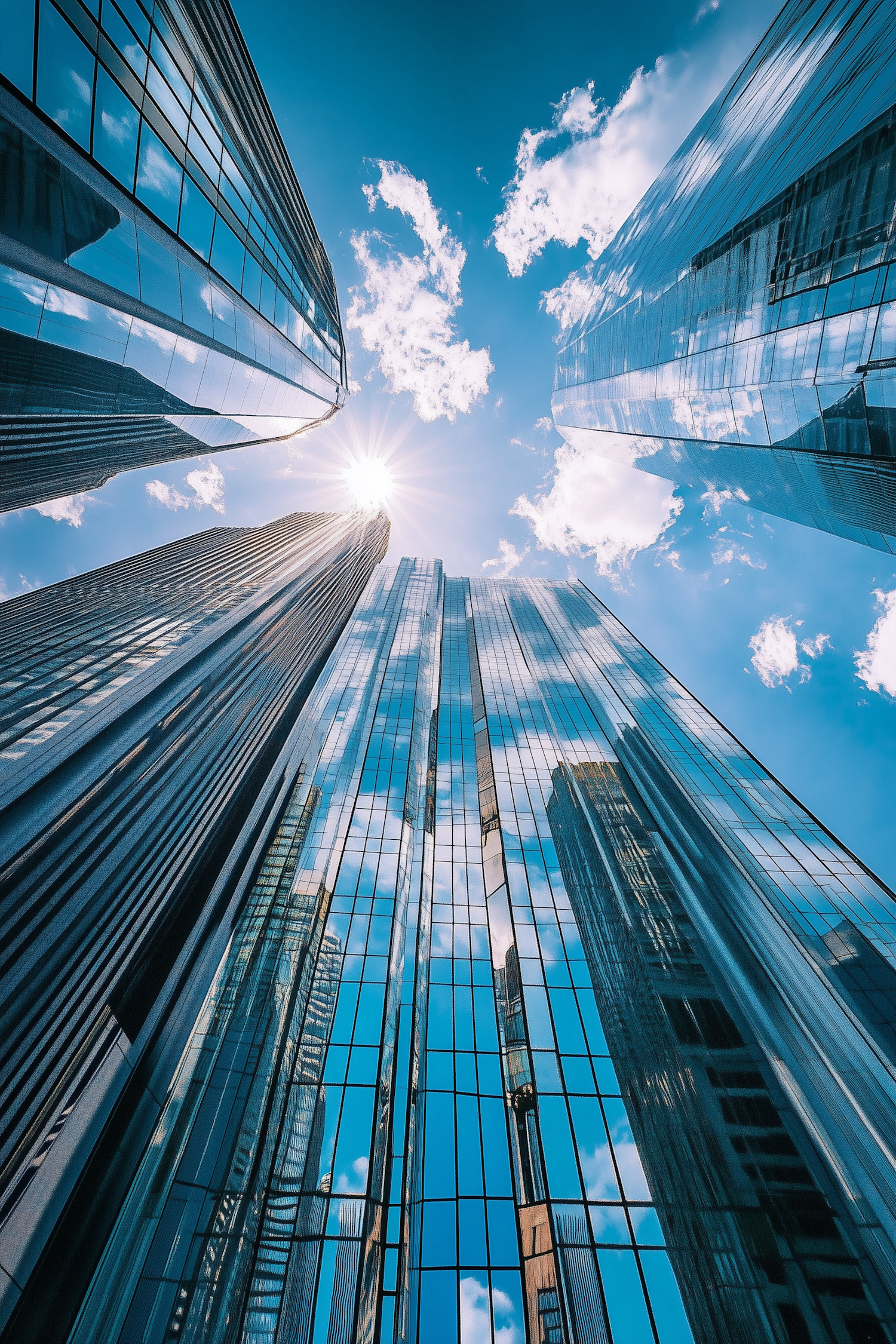 Stunning view of modern skyscrapers with reflective glass facades against a bright blue sky and sunburst effect.