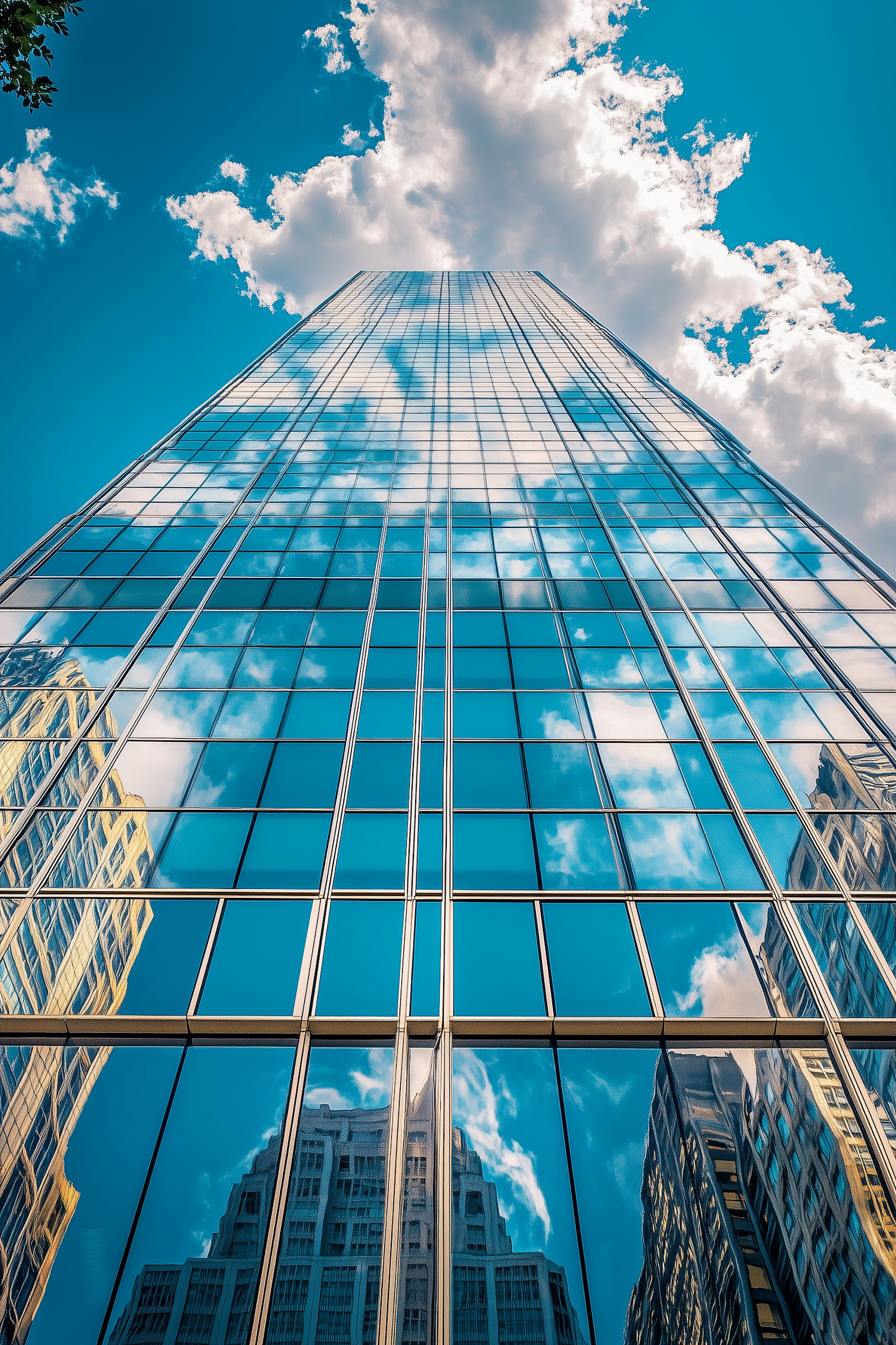 Skyscraper with reflective glass facade capturing blue sky and clouds, creating a stunning urban landscape view.