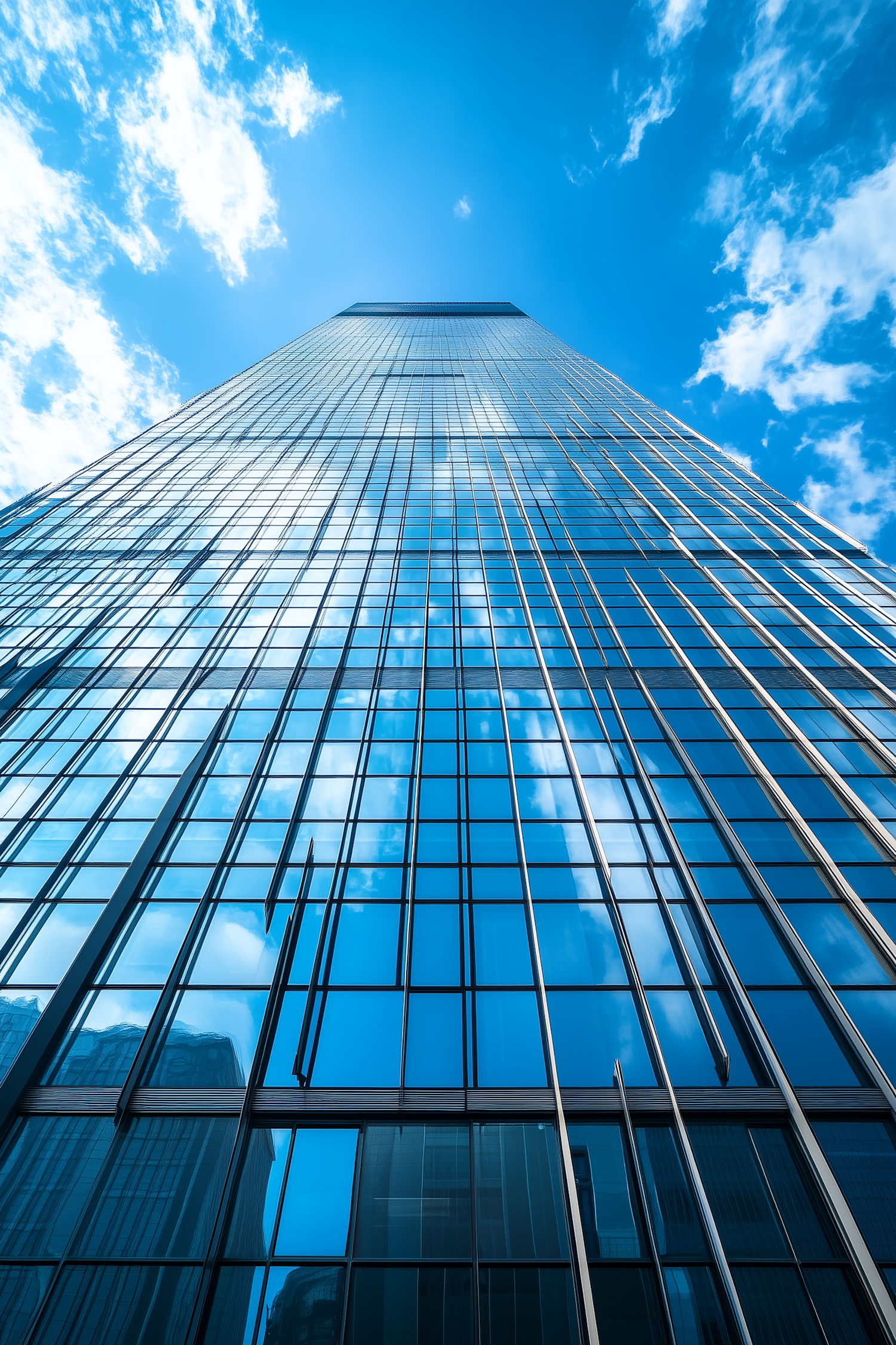 Stunning upward view of a skyscraper with reflective glass facade against a bright blue sky and scattered clouds.