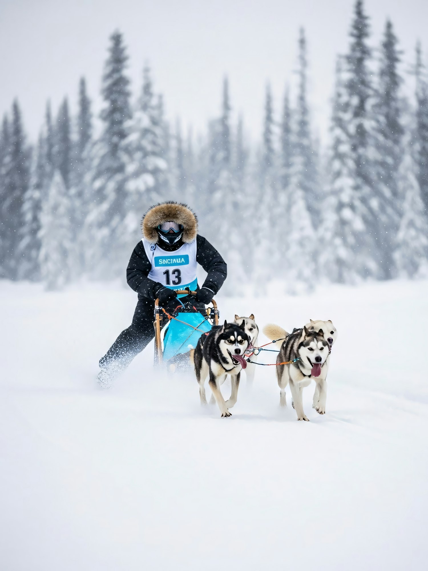 A musher and a team of huskies sled through a snowy forest, showcasing the thrill of winter sports and the beauty of a snowy landscape.
