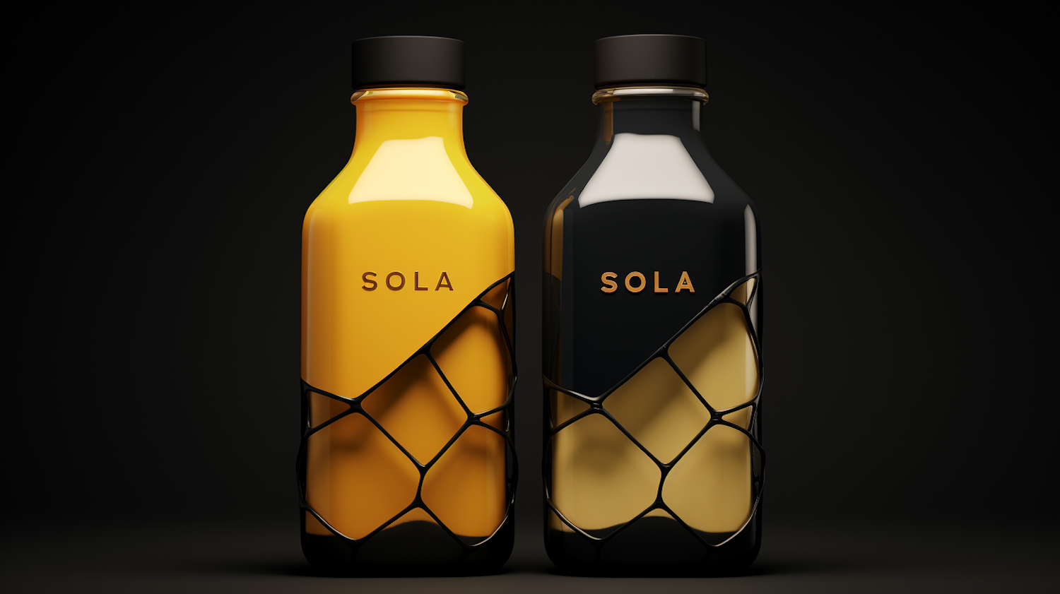 Two stylish 'SOLA' bottles in yellow and black with a unique net design, set against a dark background.