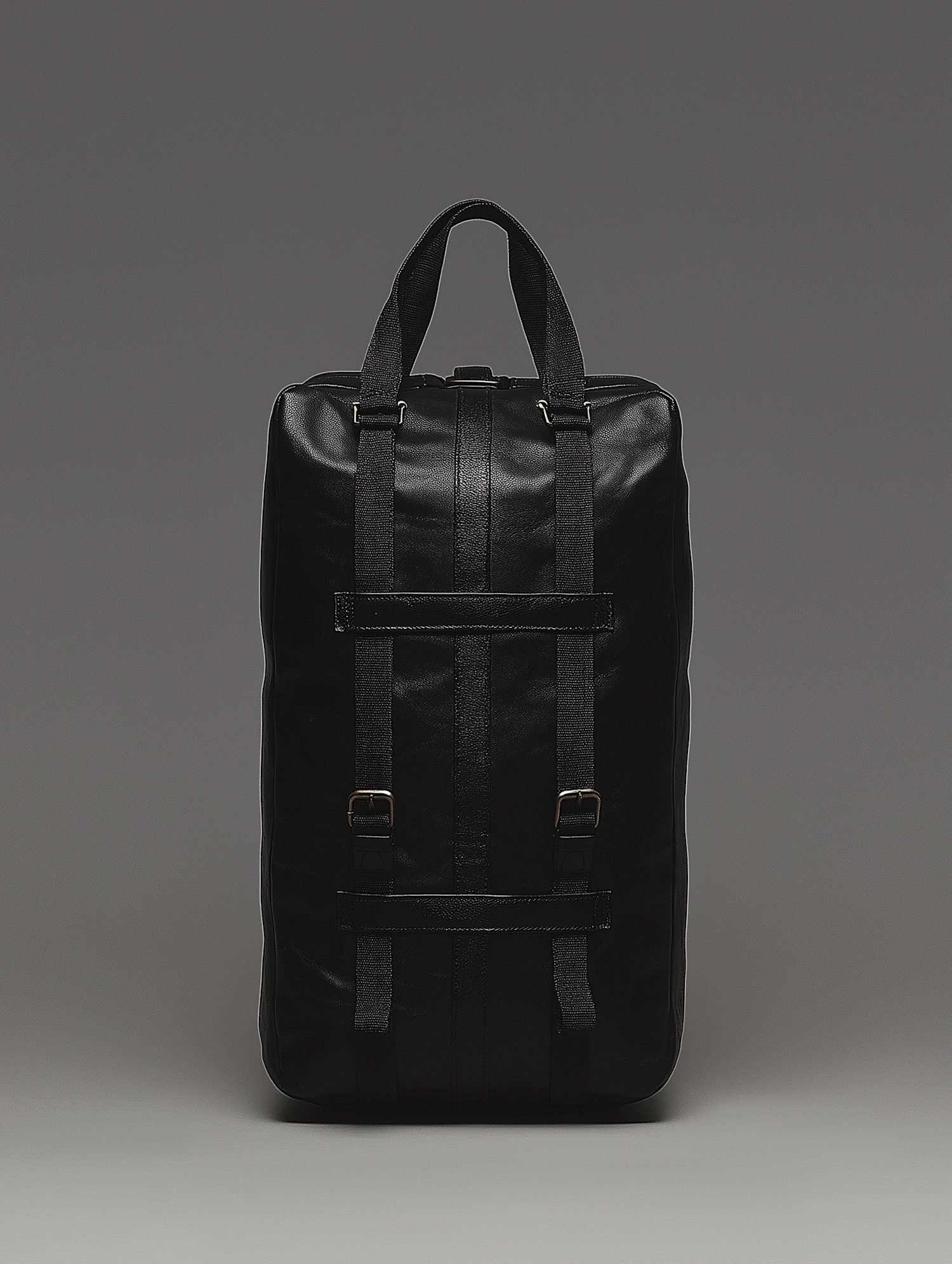Sleek black leather backpack with minimalist design, metal buckles, and dual handles against a gray background.