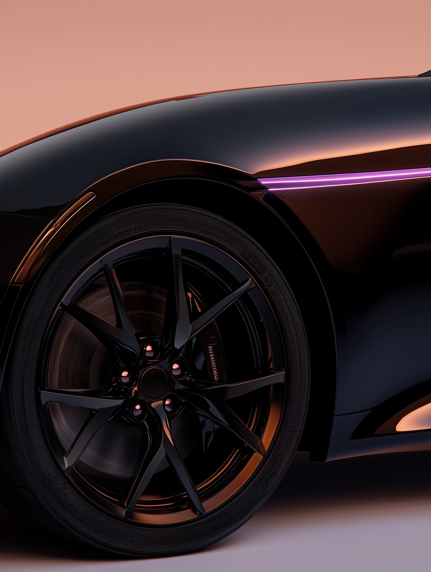 Close-up of a black car's glossy wheel and fender with glowing purple accents, reflecting warm sunset hues for a futuristic vibe.