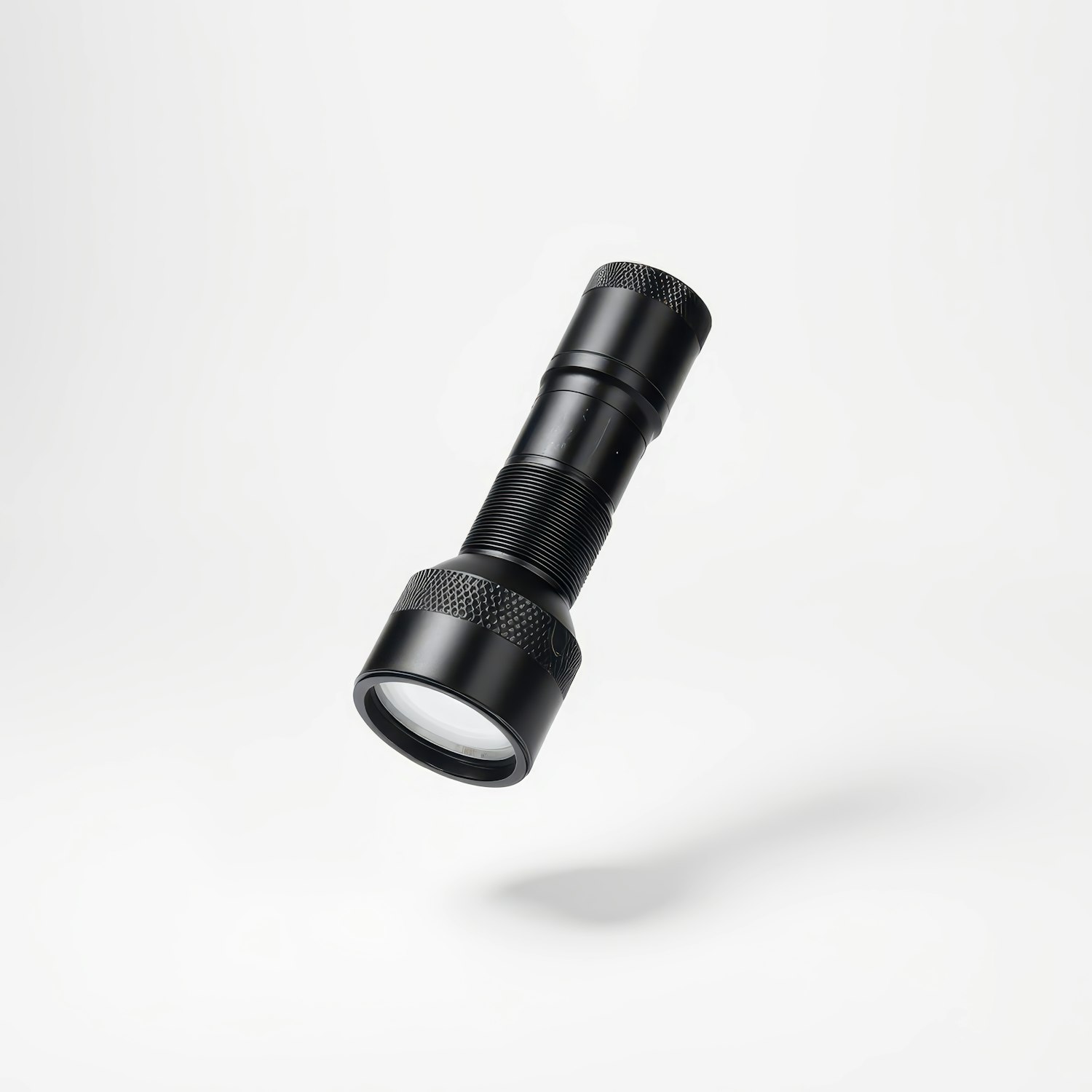 Sleek black flashlight with textured grip, suspended mid-air on a white background, showcasing modern design and functionality.
