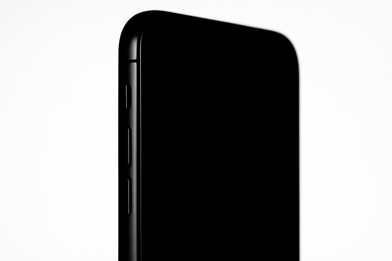 Minimalist close-up of a sleek black smartphone with rounded edges and volume buttons, set against a clean light background.