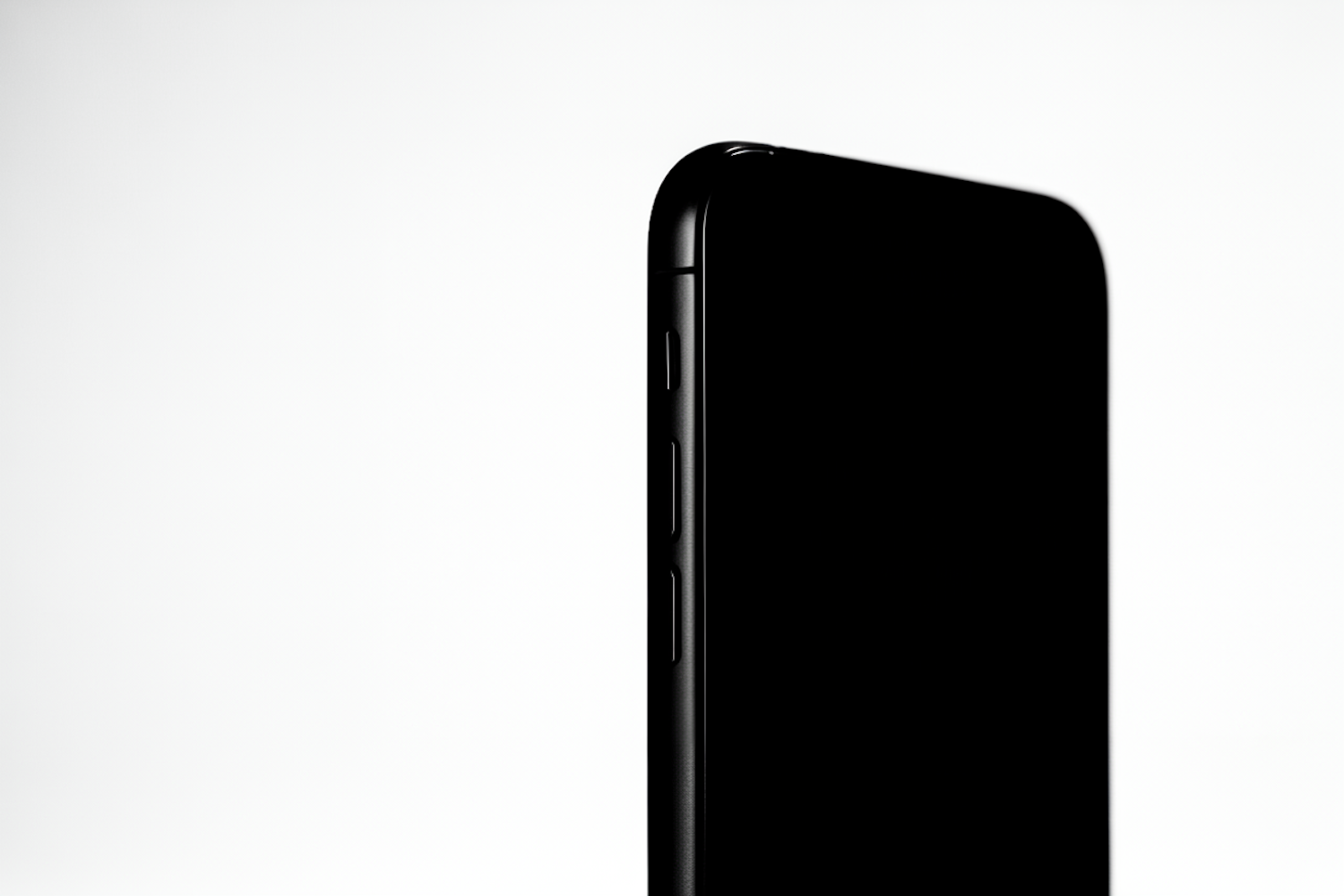 Minimalist close-up of a sleek black smartphone with rounded edges and side buttons, set against a clean white background.