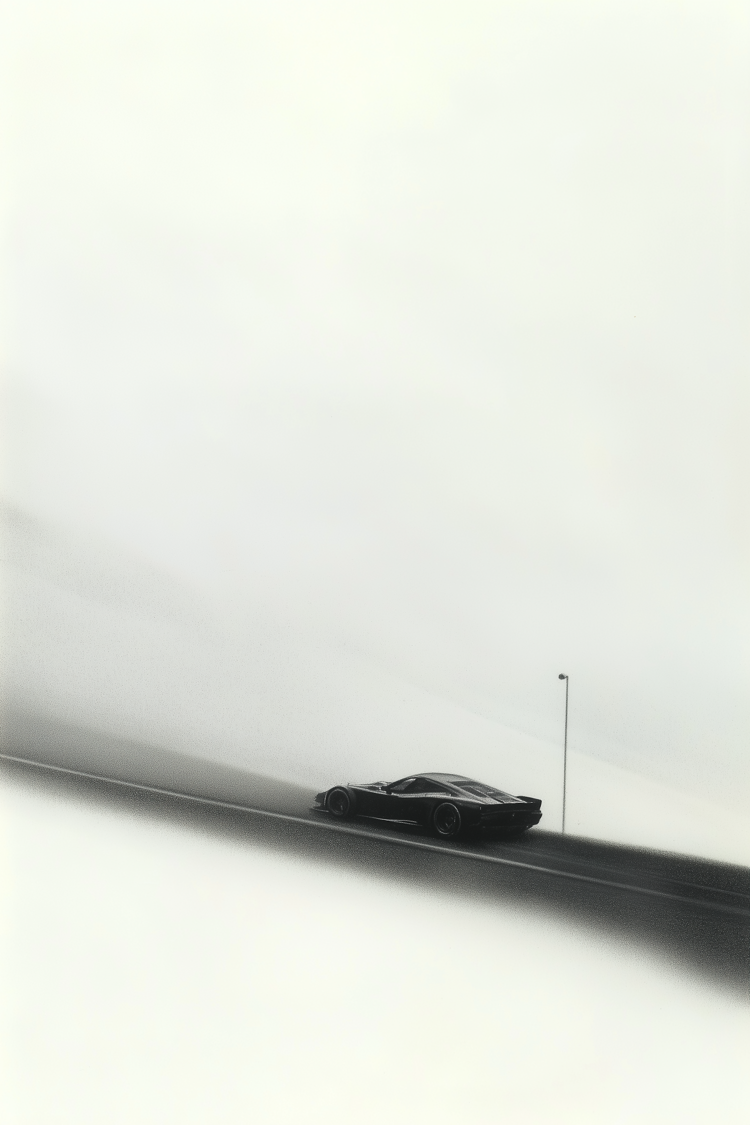A black sports car drives on a foggy road, its sleek design contrasting with the minimalistic, monochromatic surroundings.