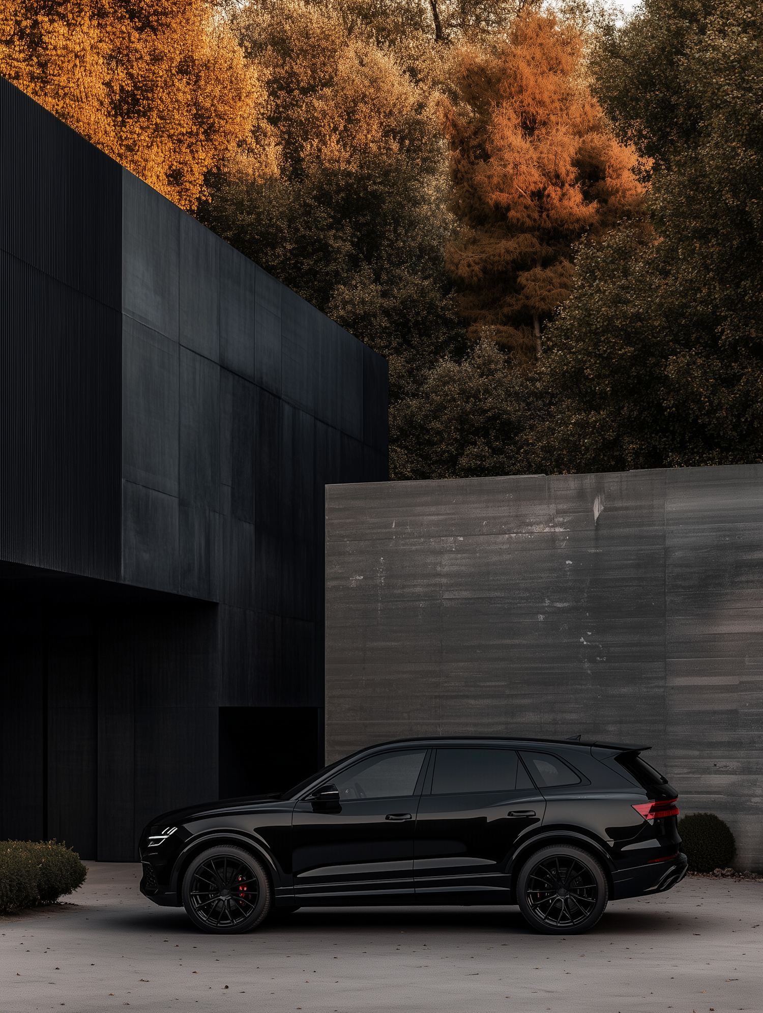 A luxurious black SUV parked by a modern building, surrounded by golden autumn trees and sleek architectural design.