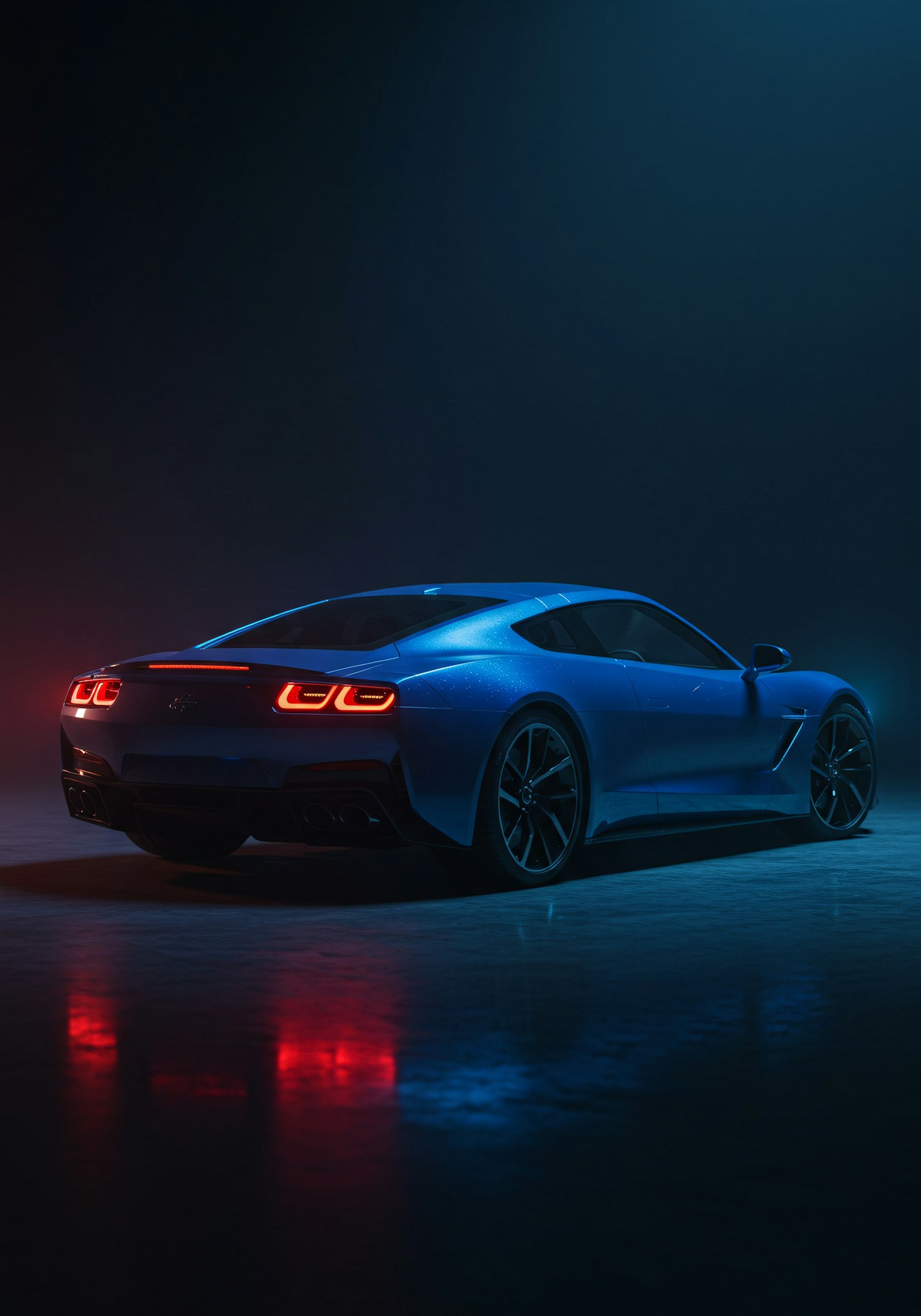 A stunning blue sports car with glowing red taillights in a dramatic, dimly lit studio setting. Sleek design and vibrant lighting.