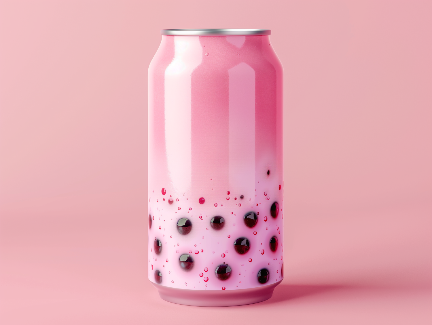 Stylish pink can with bubble tea design, featuring black tapioca pearls and a glossy finish, set against a soft pink background.