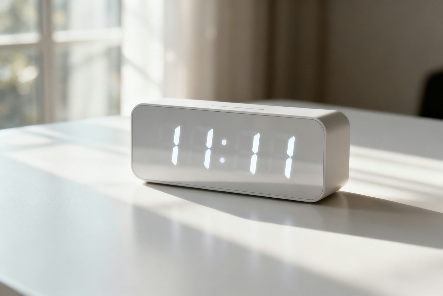 A sleek white digital clock displaying 11:11 sits on a white surface, bathed in soft natural light from a nearby window.