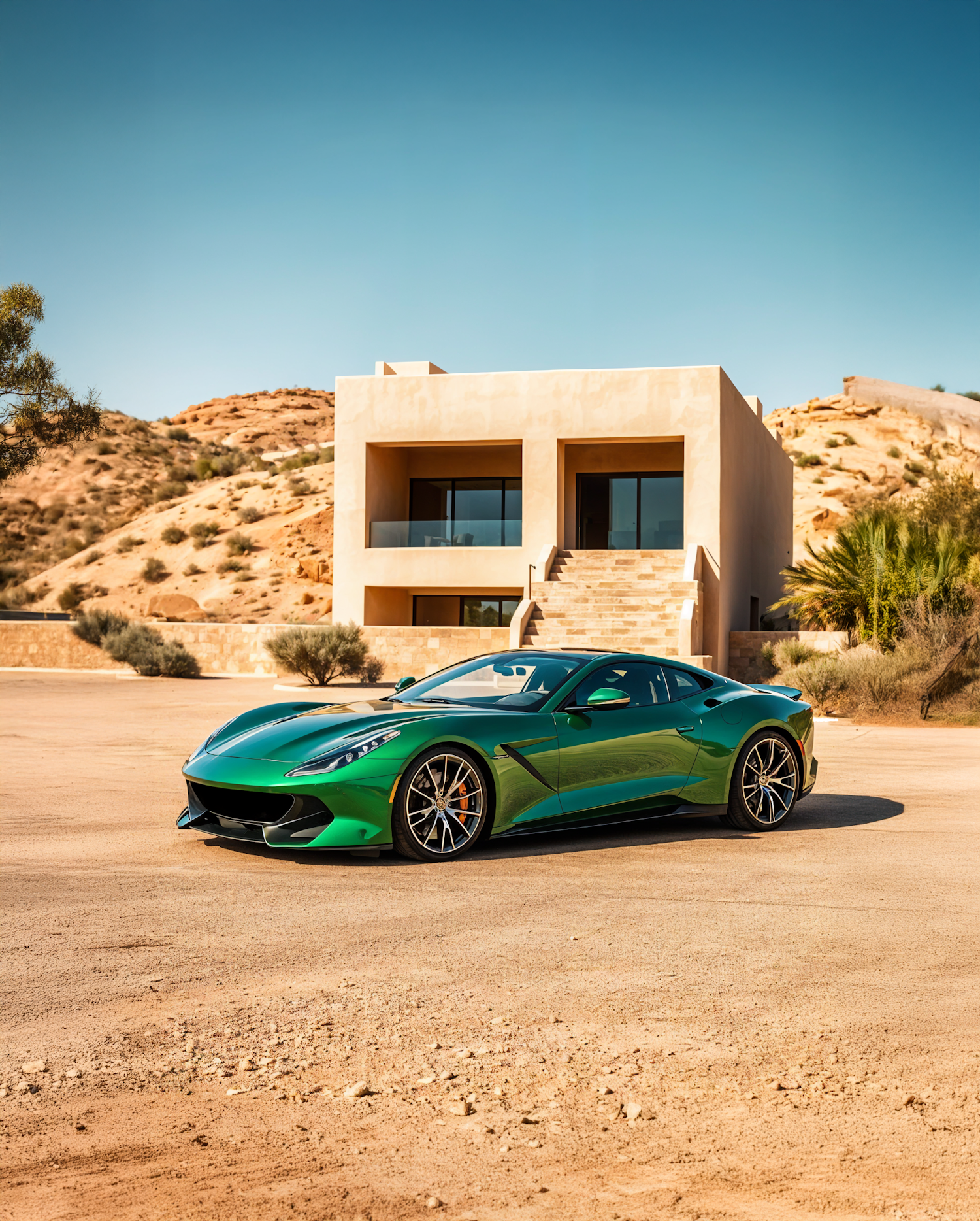 Green sports car parked in front of a modern house in a desert landscape, showcasing luxury and elegance.