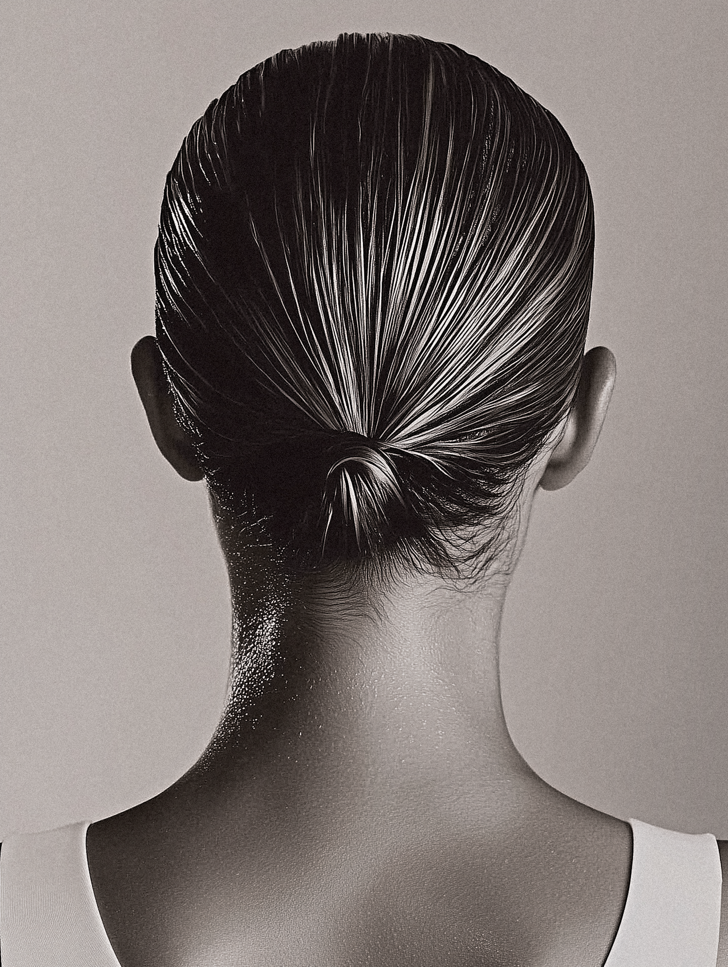 Monochrome shot of a woman with sleek hair tied in a low bun, highlighting glossy texture and smooth skin against a neutral background.