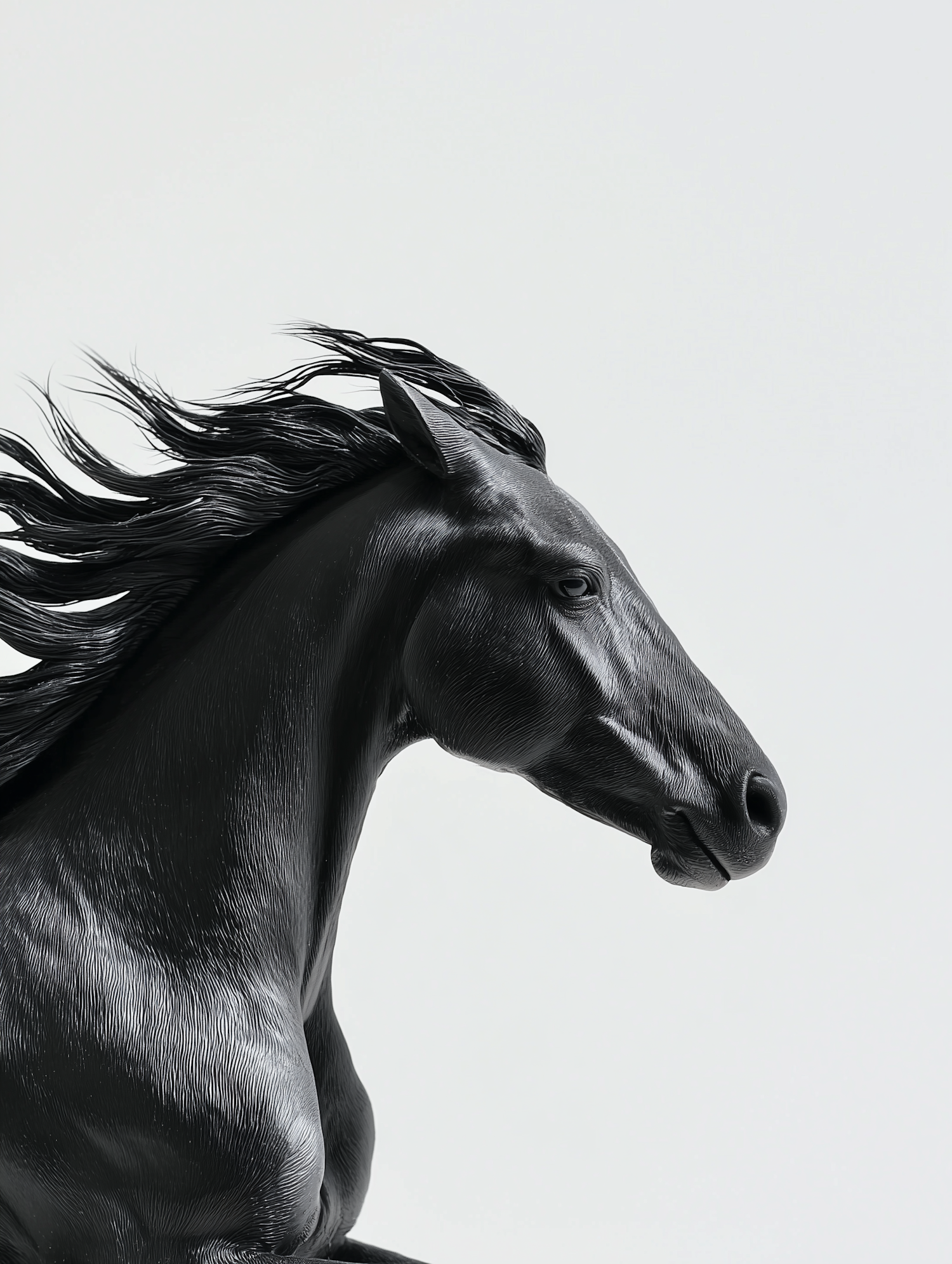 A detailed black horse sculpture with a flowing mane, captured in profile against a white background, showcasing intricate craftsmanship.
