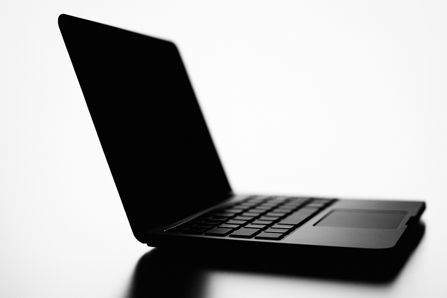 Minimalist silhouette of a sleek laptop partially open against a bright white background, showcasing its thin profile and modern design.