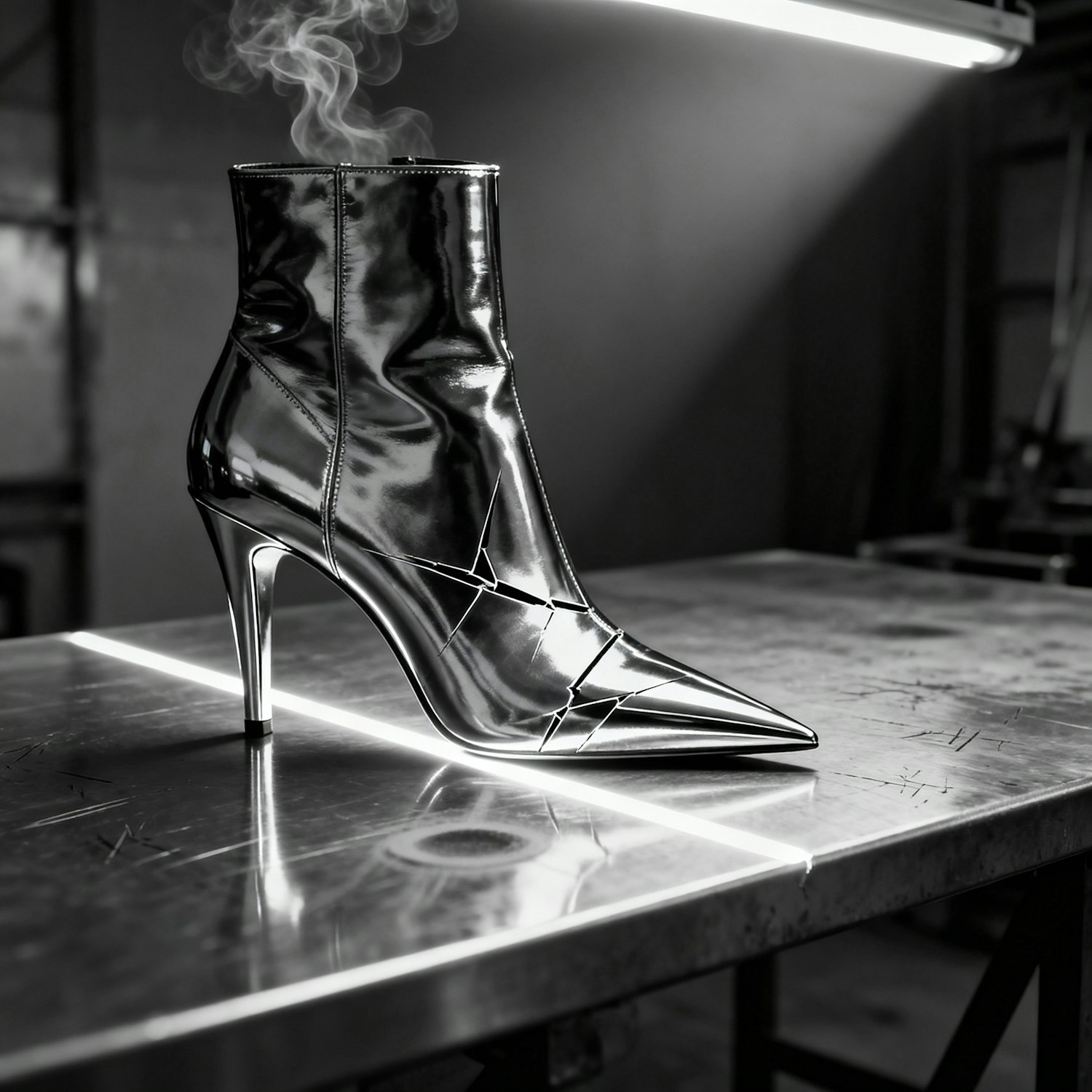 A sleek metallic high-heeled boot with a pointed toe and steam effect, showcased on a reflective surface under dramatic lighting.