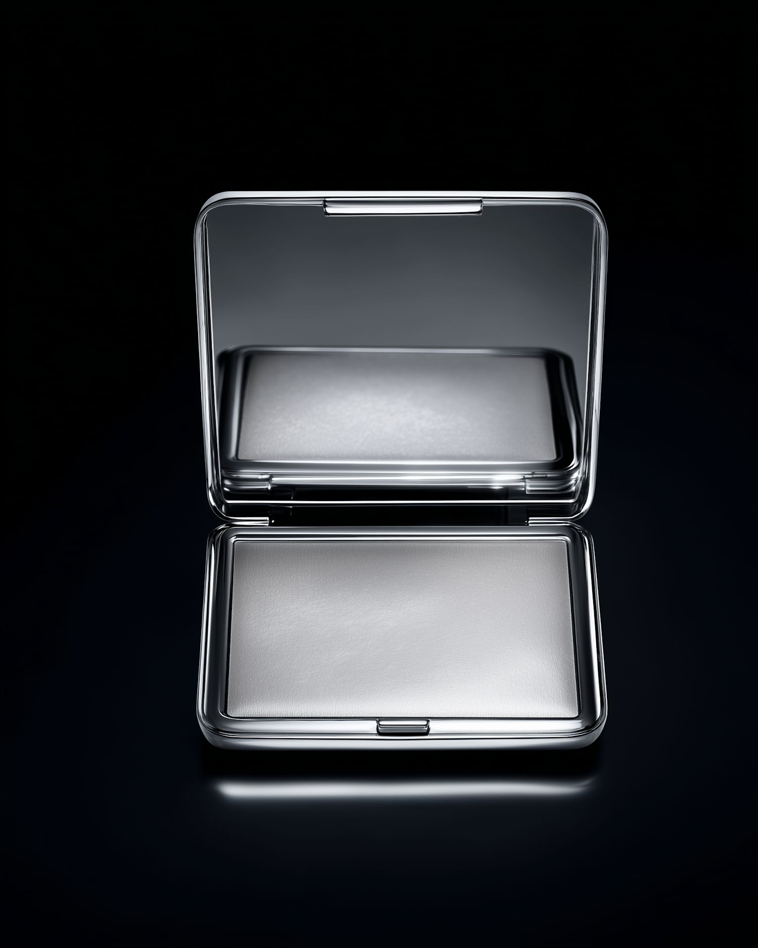 Open metallic compact case with a mirror and sleek design, set against a black background for a modern and elegant look.