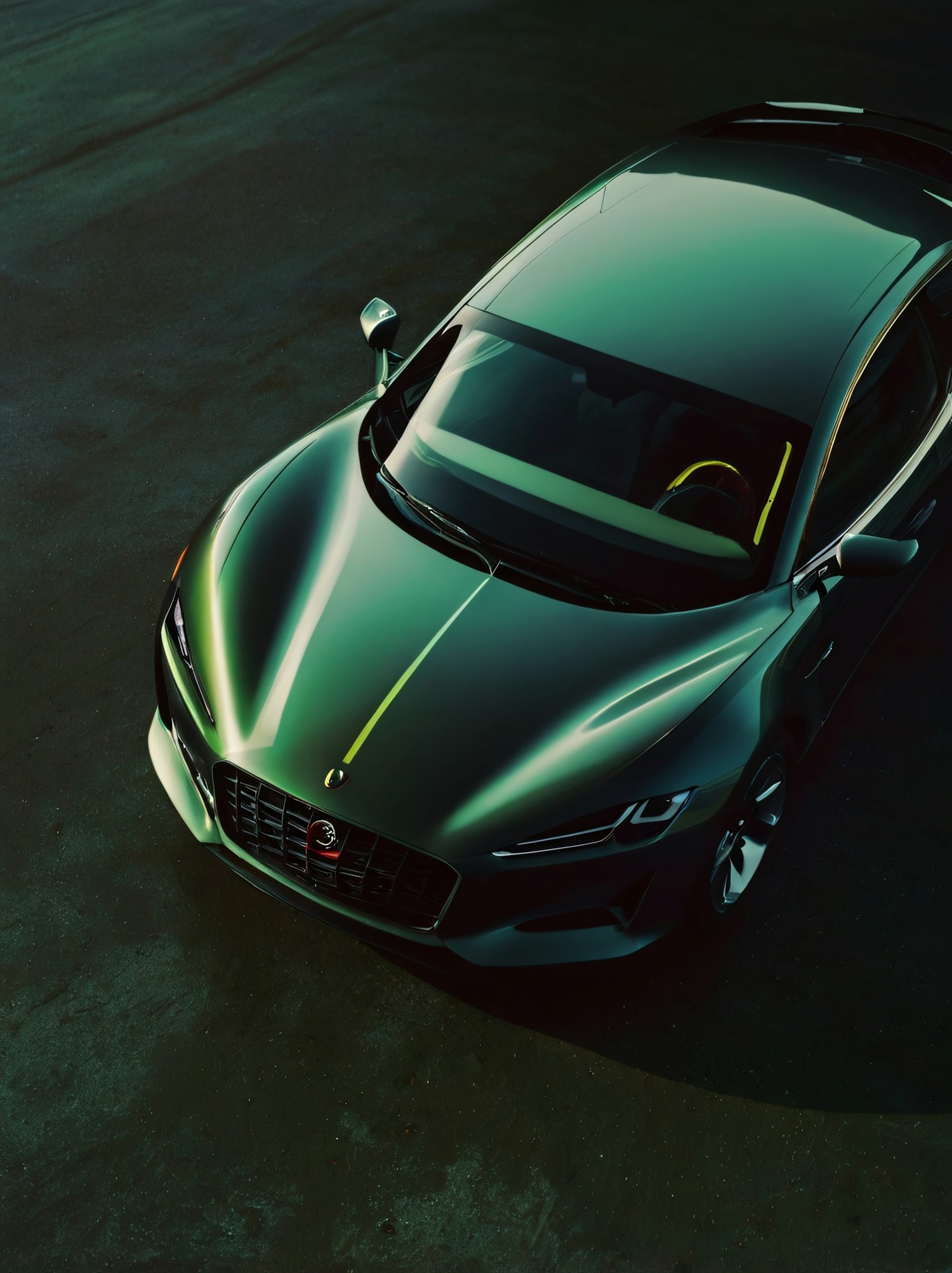Sleek green car with yellow stripe, sharp headlights, and distinctive grille on dark surface. Modern design and glossy finish.