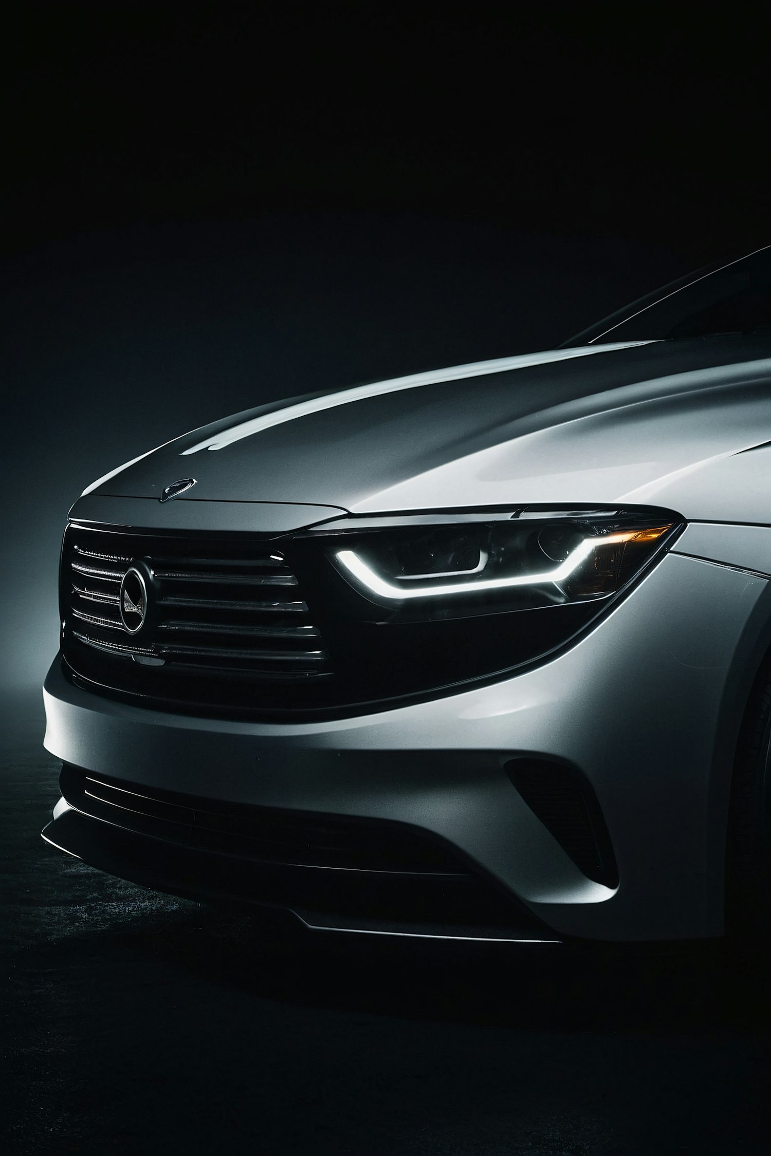 Sleek silver car with striking LED headlights and glossy black grille in a dimly lit setting, exuding luxury and modern design.