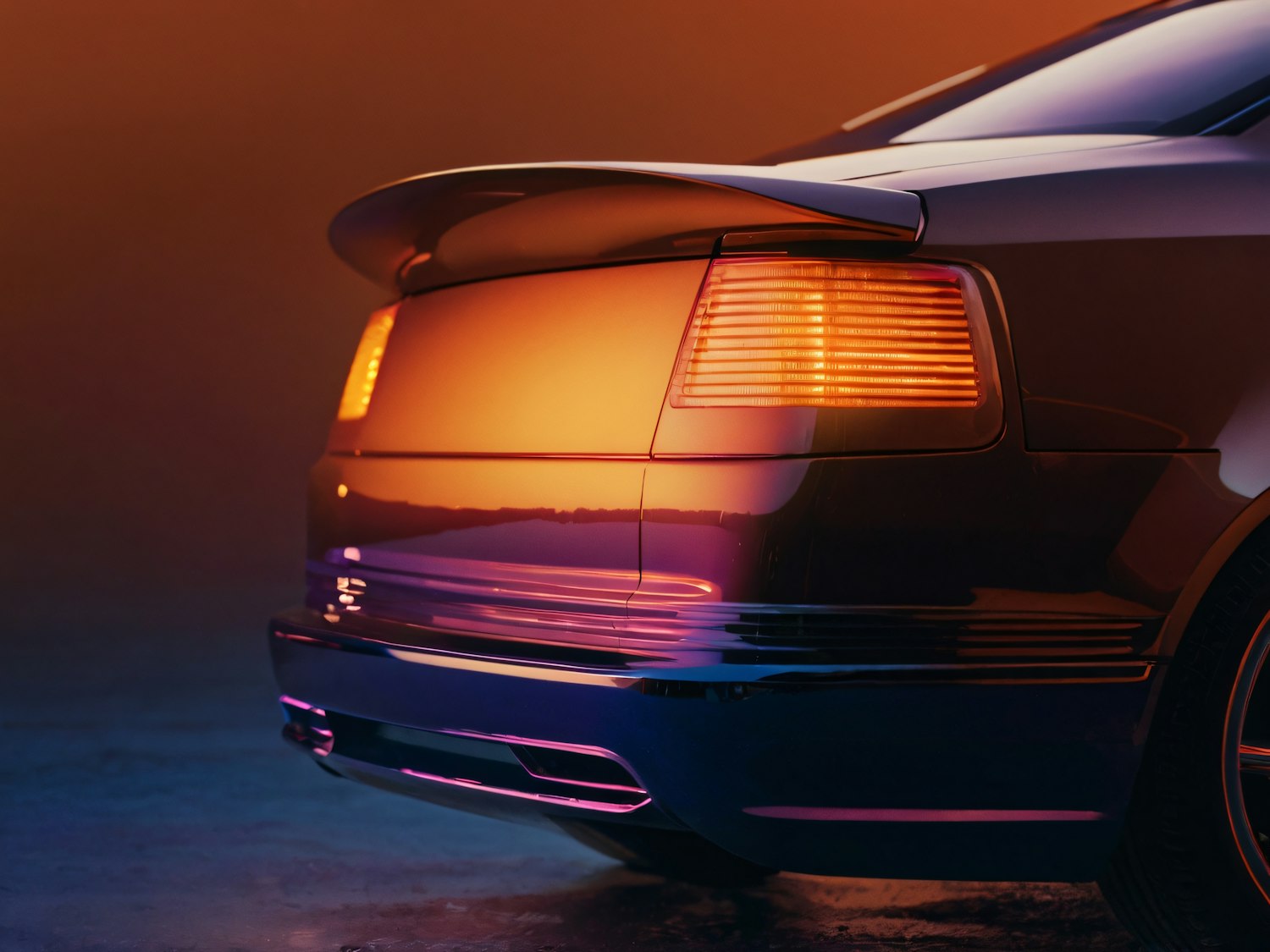 Sleek car rear with illuminated orange taillights, glossy purple body, and dramatic lighting for a futuristic look.