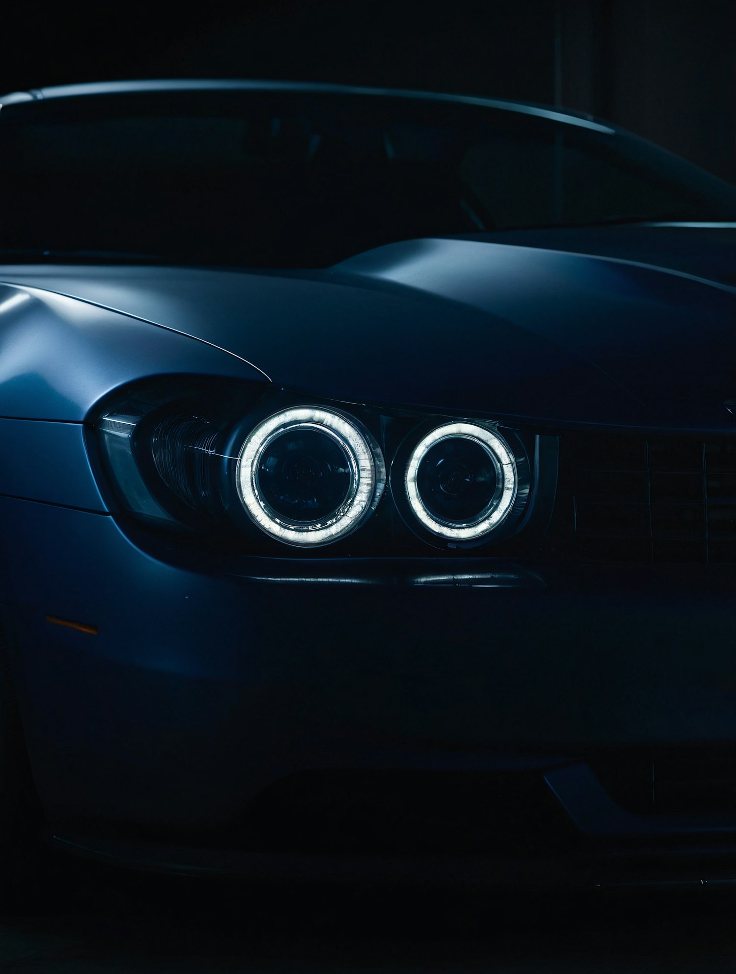 Close-up of a sleek blue car with illuminated LED headlights in a dark setting, highlighting its modern design and glossy finish.