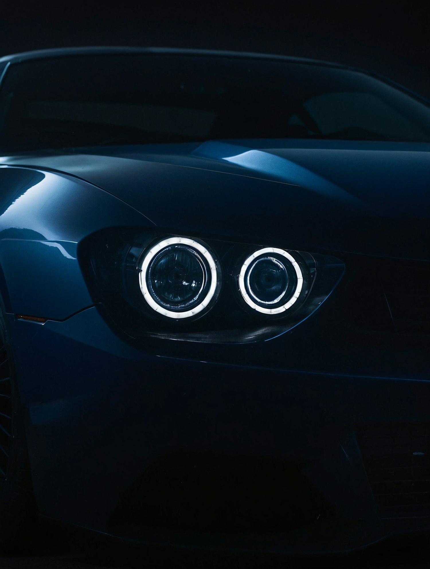 Sleek dark blue car with illuminated circular LED headlights in a dimly lit setting, highlighting its modern design.