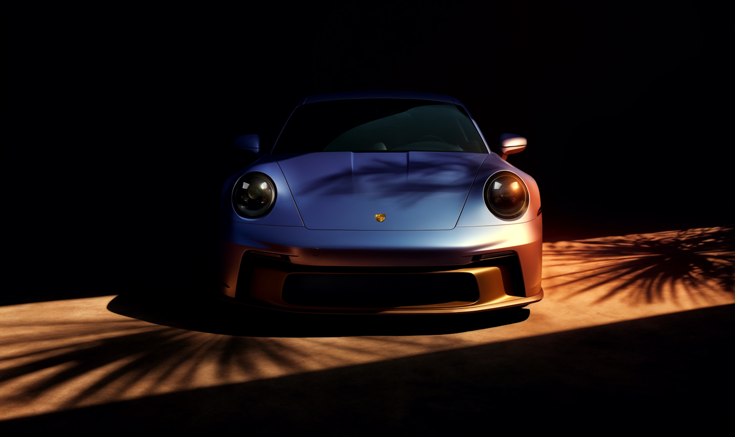 A sleek metallic blue Porsche 911 sports car with dramatic lighting and palm leaf shadows, emphasizing its luxury and modern design.
