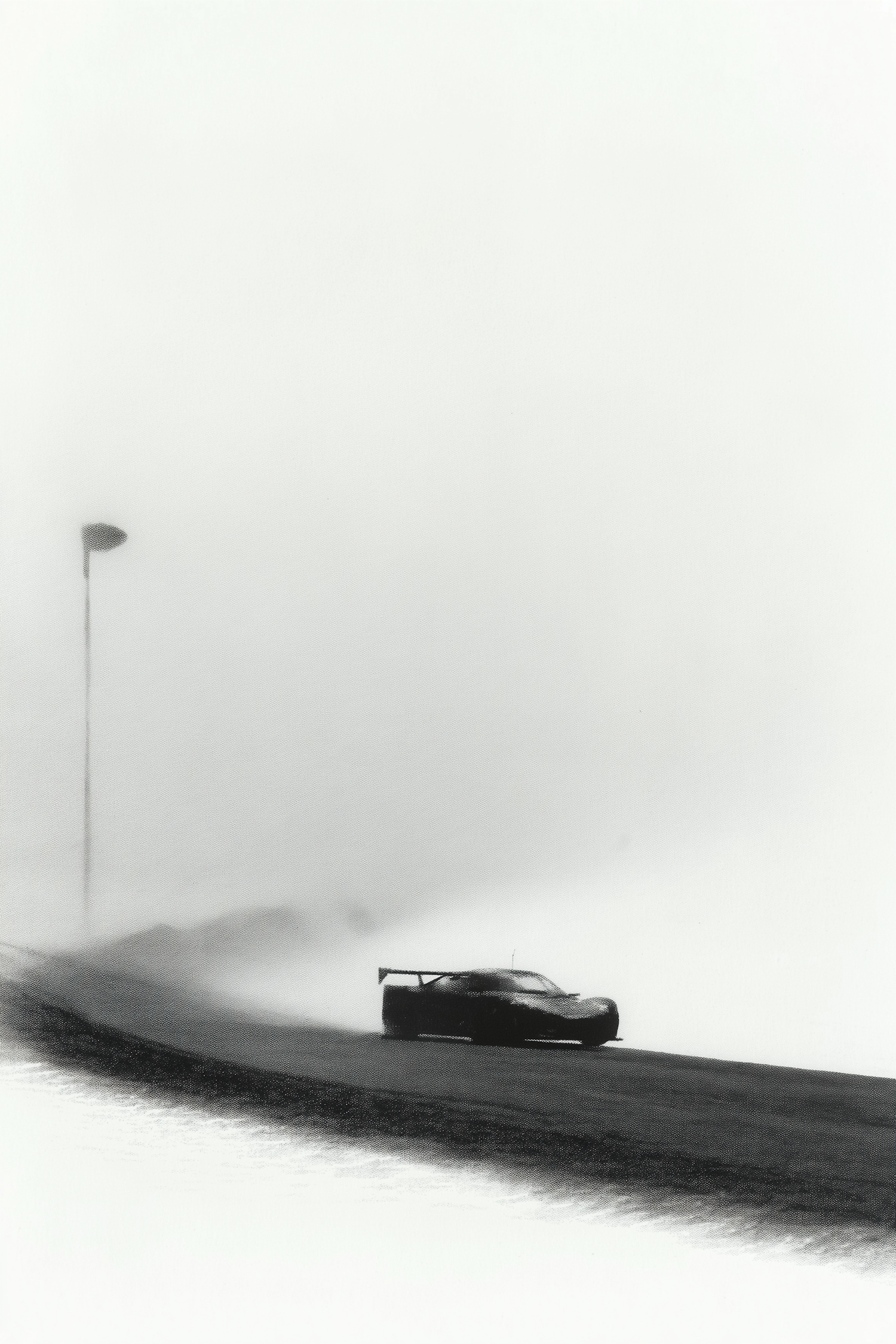 A race car speeds through a foggy road, its silhouette sharp against the misty background, creating a dramatic and timeless scene.