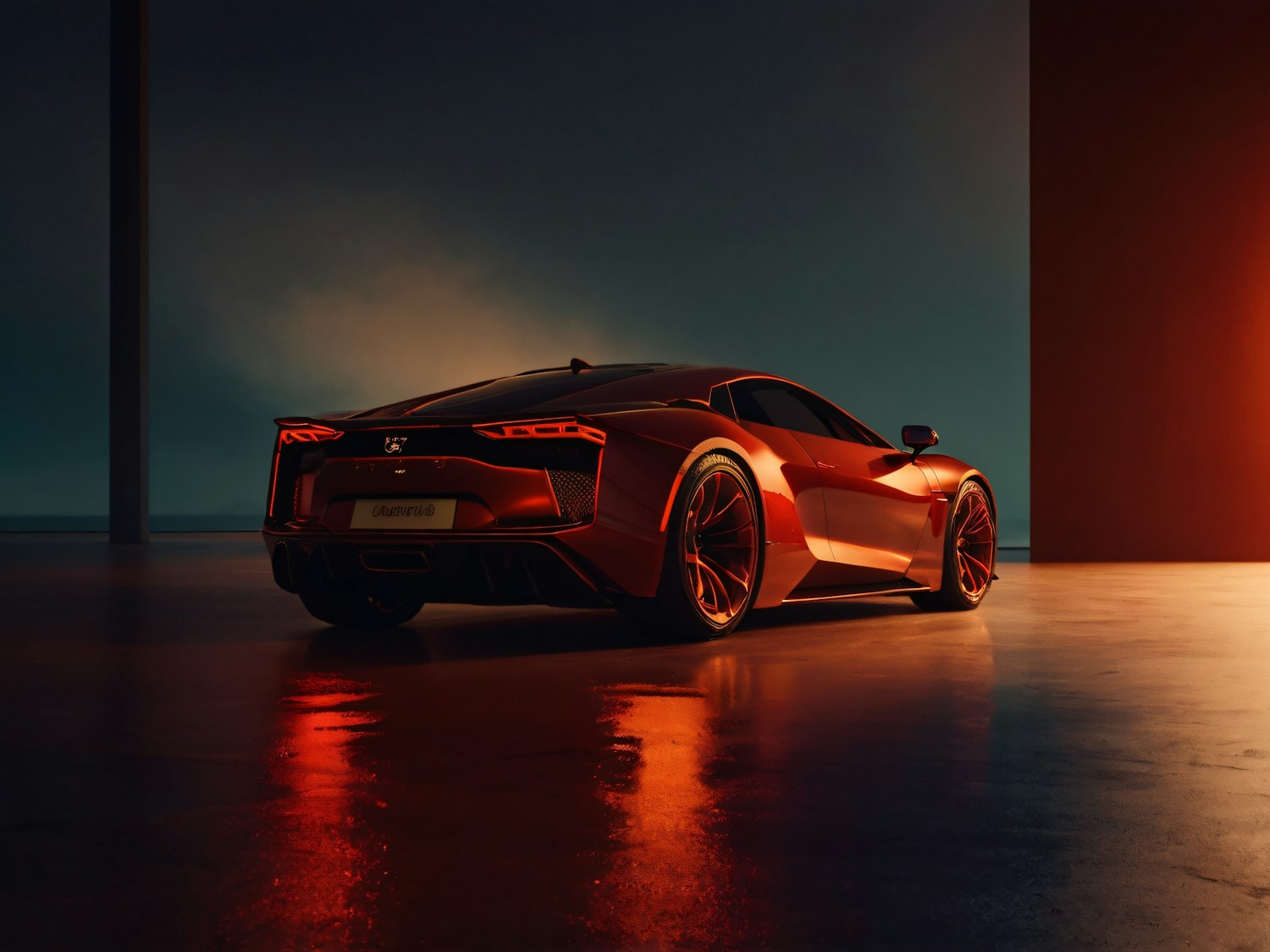 A stunning red sports car with angular taillights and sleek design, illuminated by dramatic lighting in a modern indoor setting.