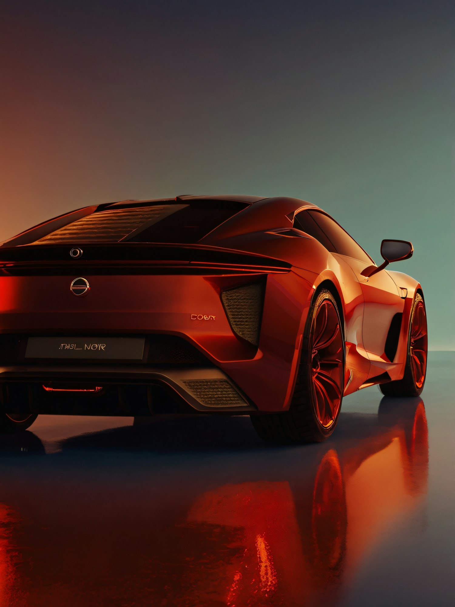 Sleek red sports car with futuristic design and striking taillights, set against a dynamic gradient background.