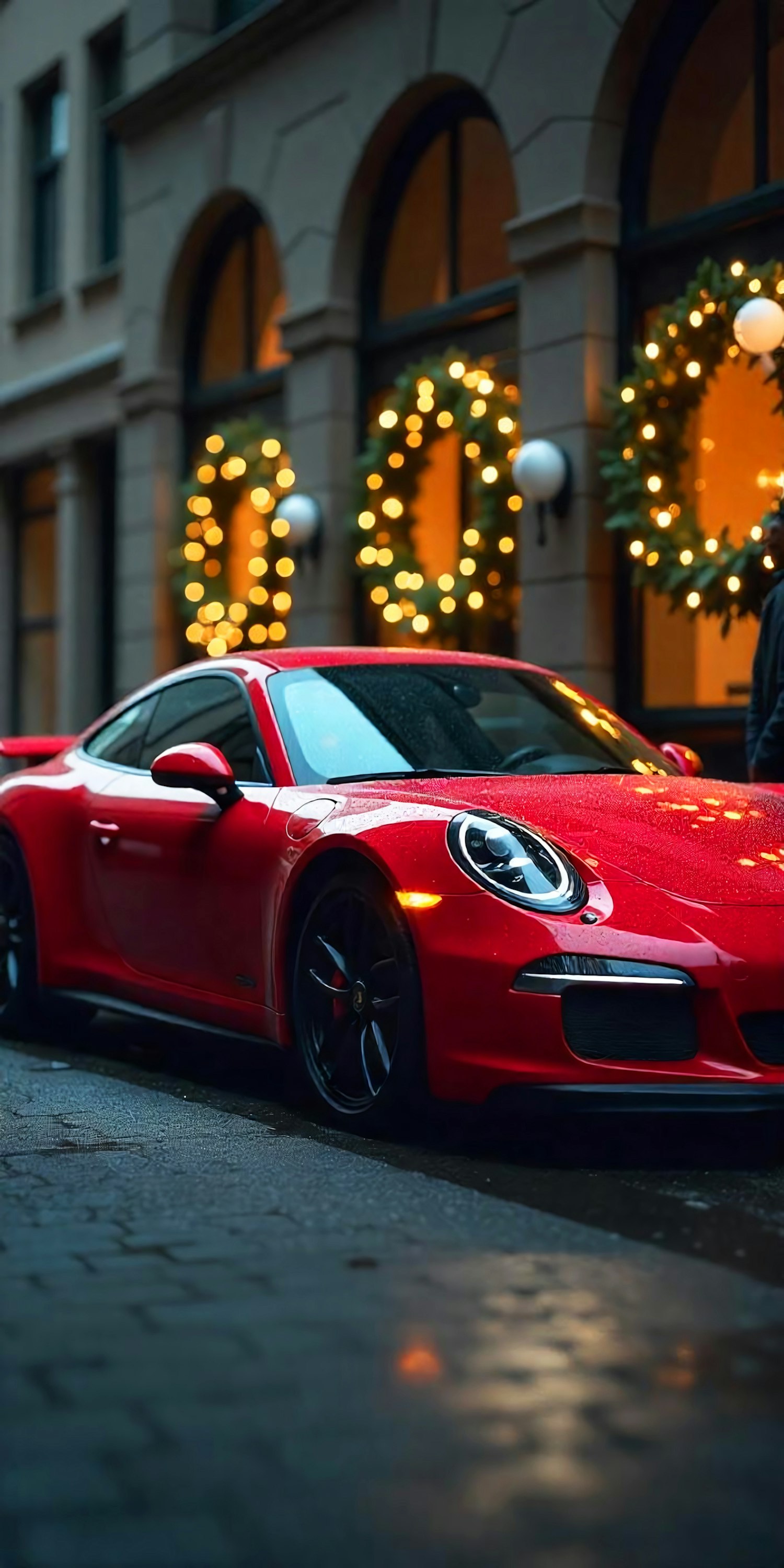 Red sports car on wet street with festive wreaths and lights in background, creating a luxurious holiday atmosphere.