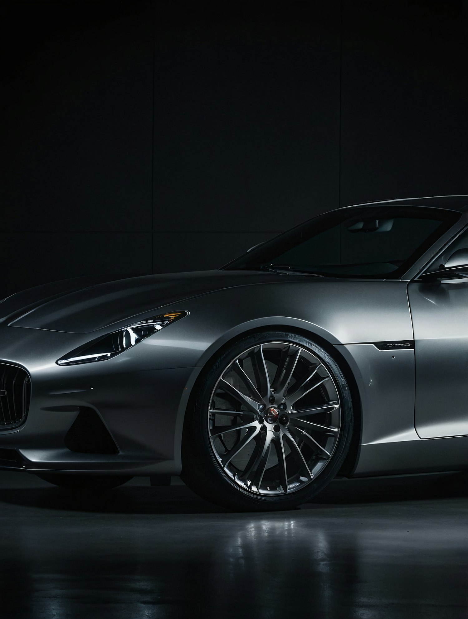 Sleek silver sports car with modern design and alloy wheels, set against a dark background for a luxurious look.