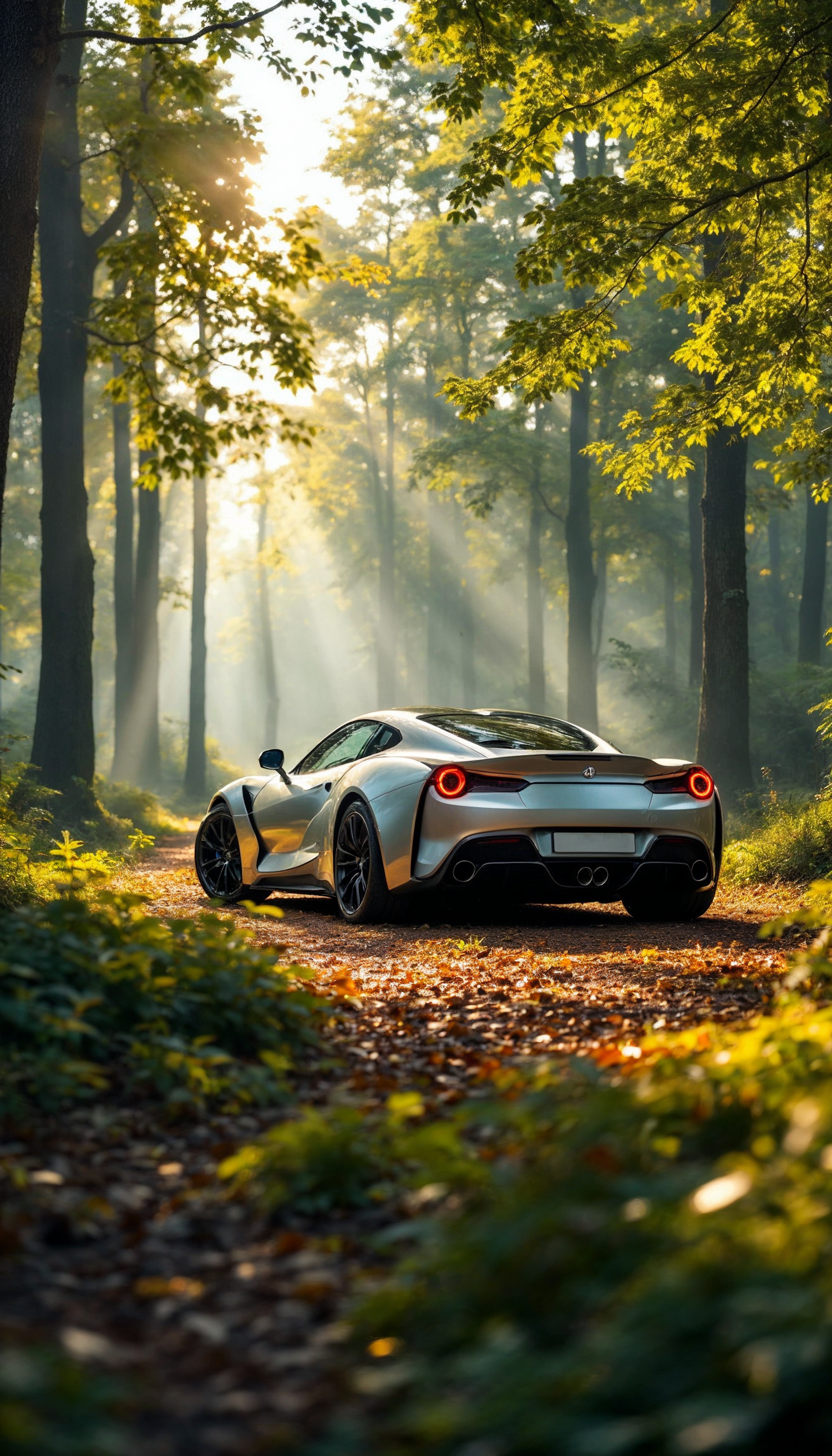 Sleek silver sports car on a forest path, bathed in sunlight filtering through lush green trees, creating a serene and adventurous scene.