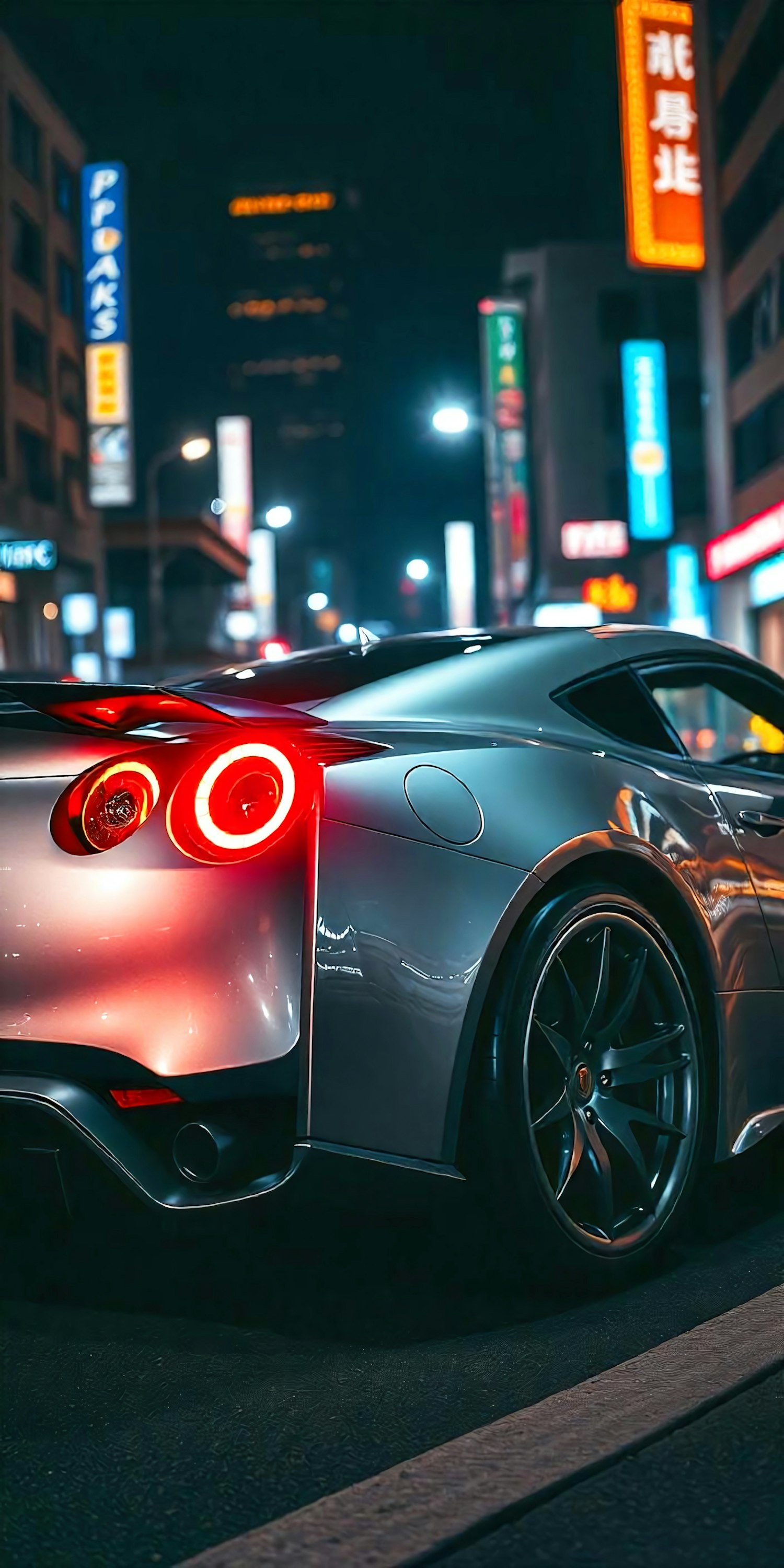 Sleek silver sports car with glowing taillights in a vibrant city night scene, surrounded by illuminated signs and tall buildings.