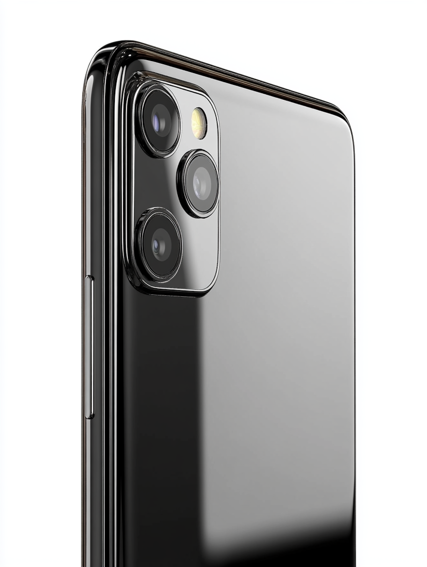 Close-up of a glossy black smartphone showcasing its triple-lens rear camera and sleek metallic design against a white background.