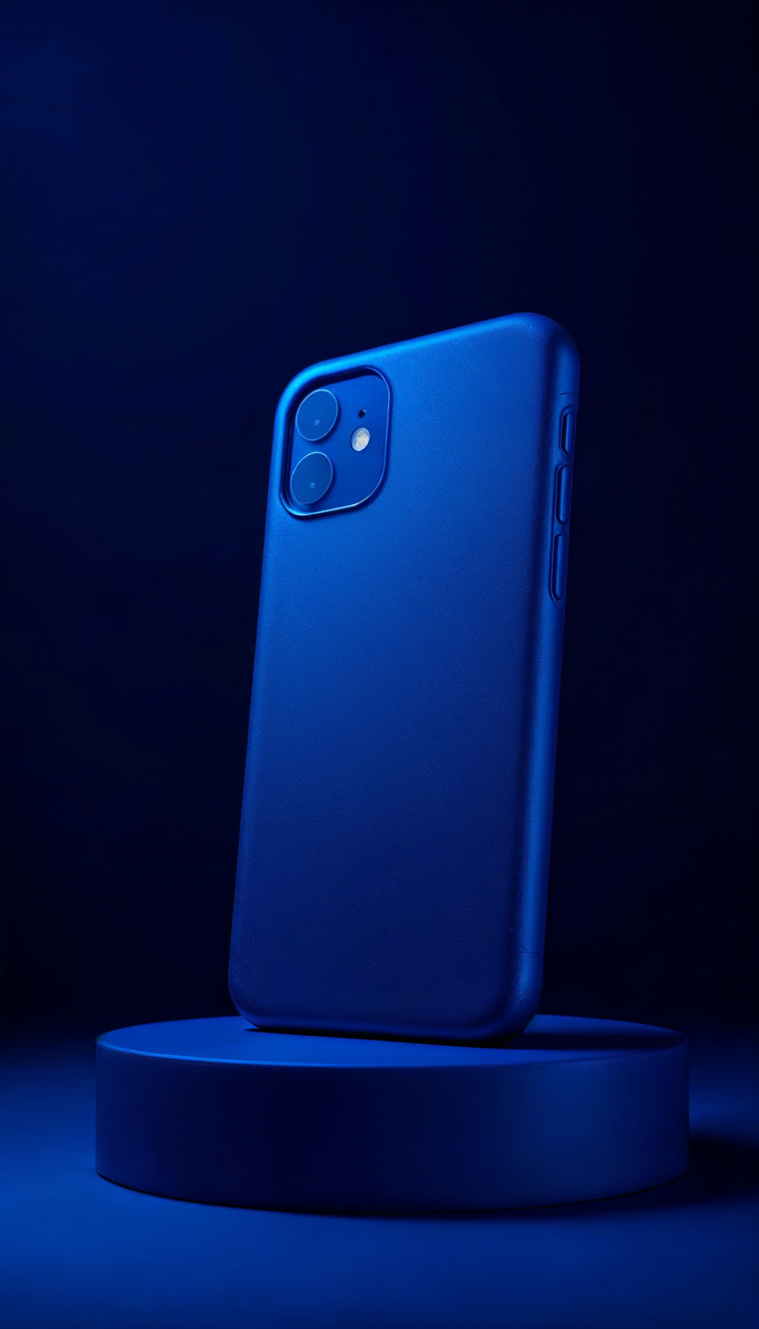 Sleek smartphone in a matte blue case on a circular platform, highlighted by deep blue lighting for a modern, elegant look.