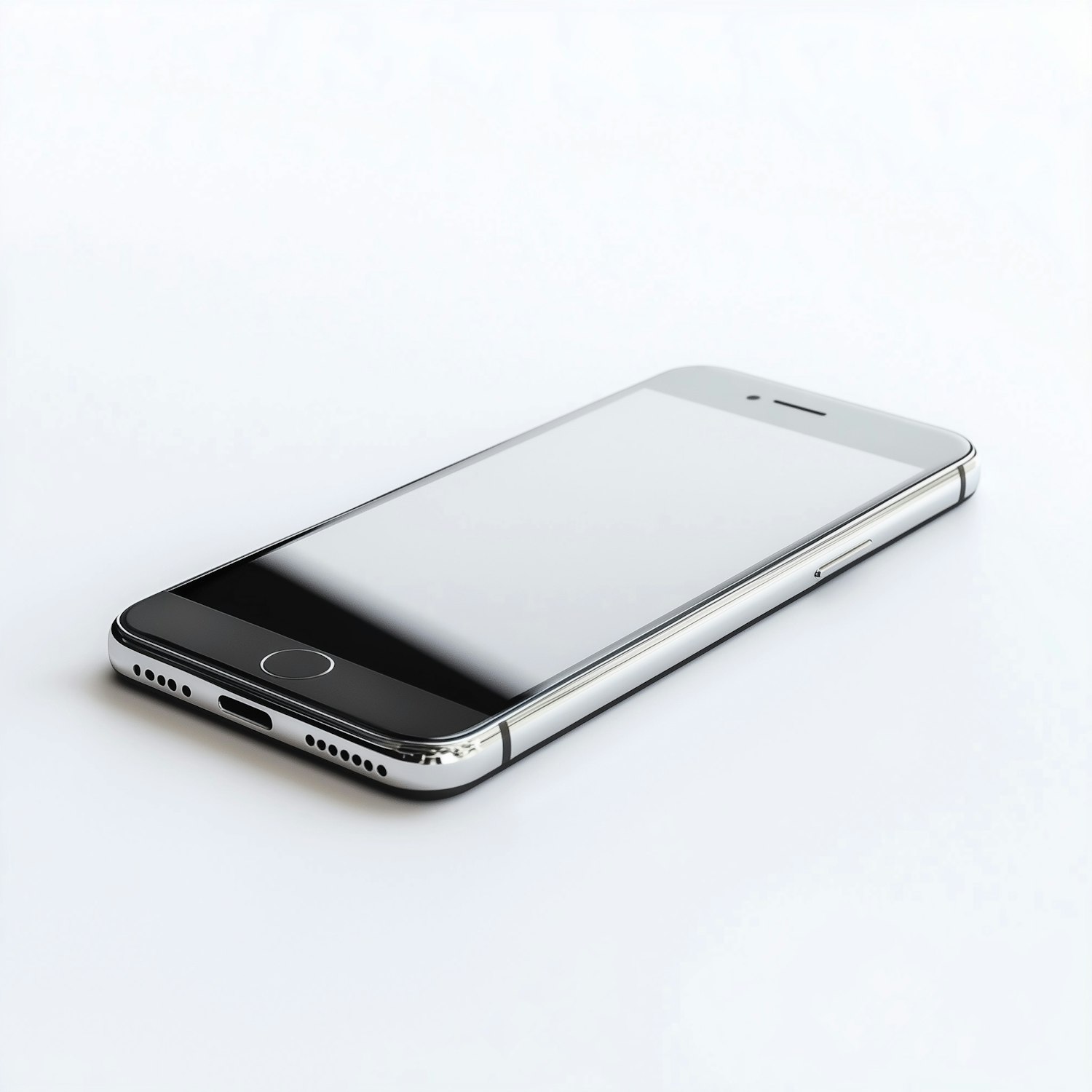A sleek silver smartphone with a black screen, home button, and metallic edges resting on a clean white surface.
