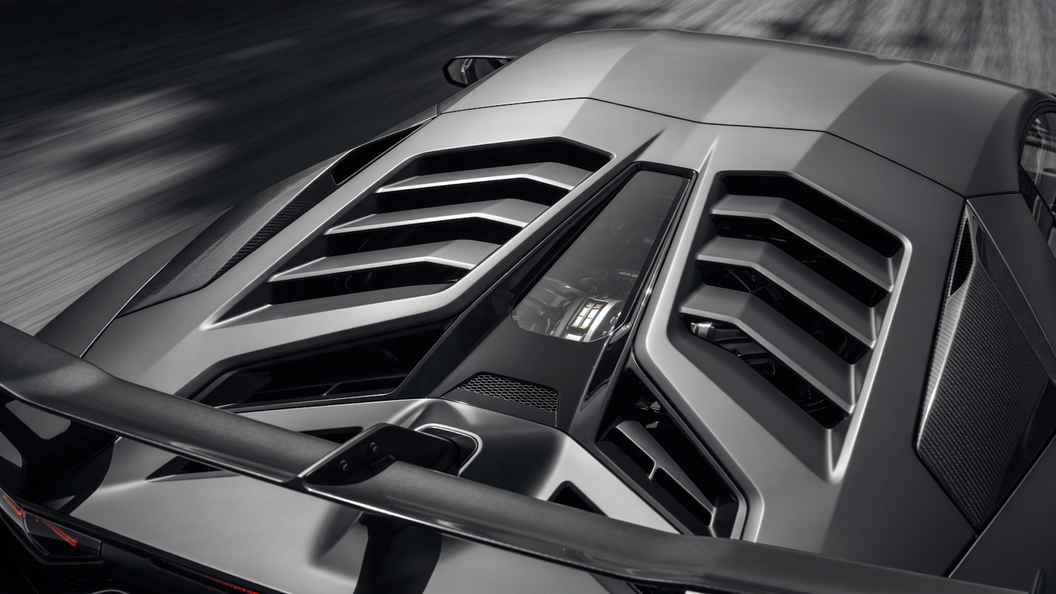 Close-up of a sleek sports car's rear, highlighting its aerodynamic design, air vents, and engine details under a transparent panel.