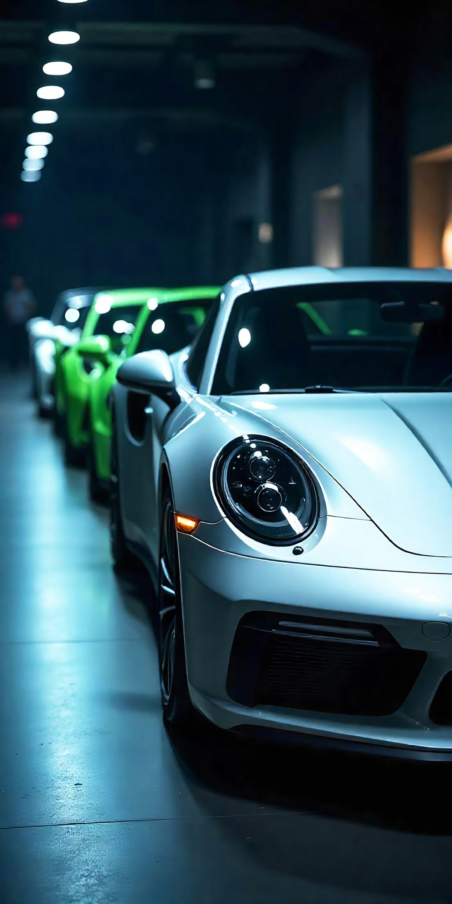 Luxury sports cars in a dimly lit showroom, featuring a silver car in the foreground and vibrant green cars in the background.