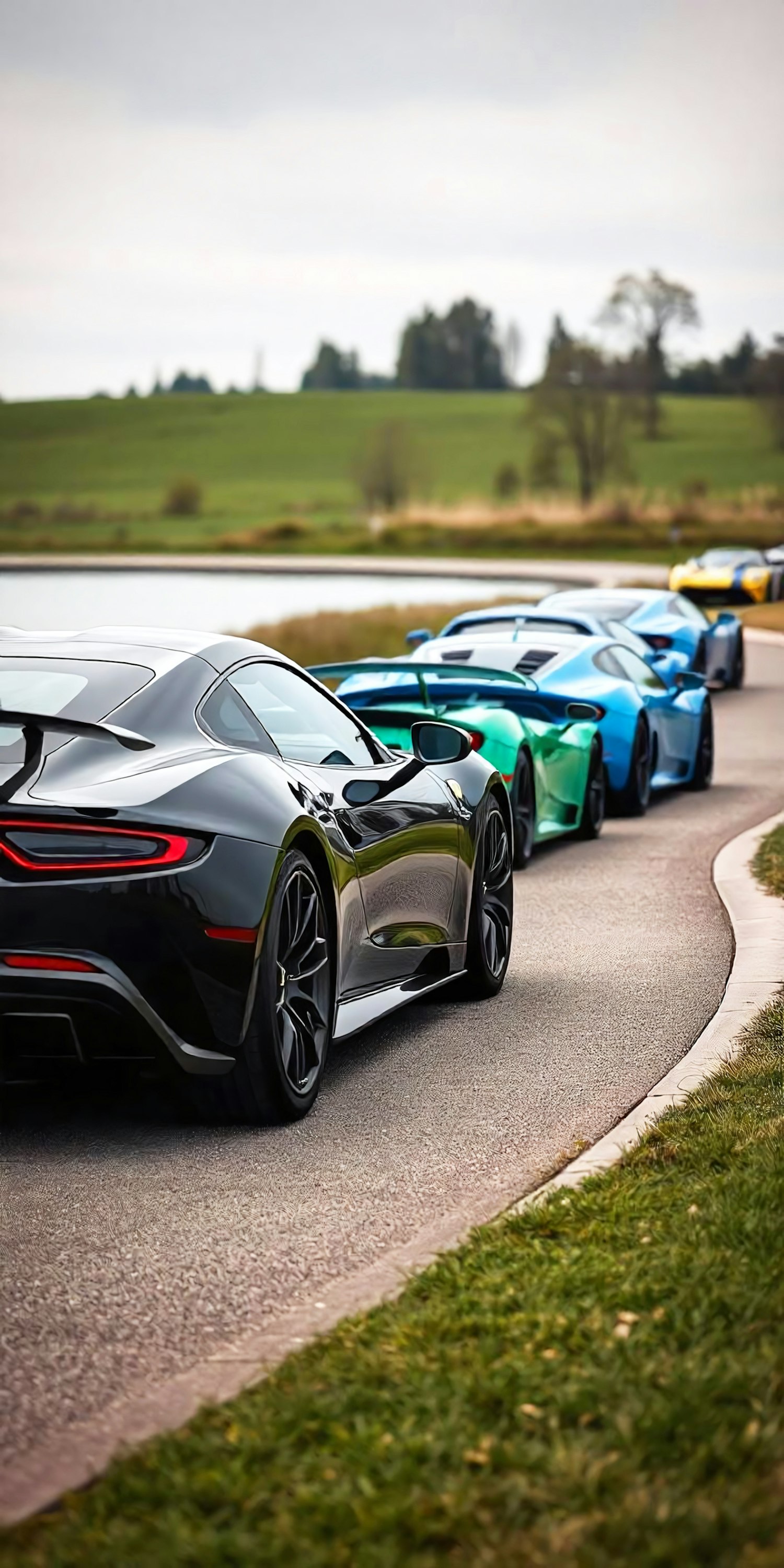 A lineup of colorful sports cars on a winding road, featuring sleek designs and vibrant colors against a lush green backdrop.
