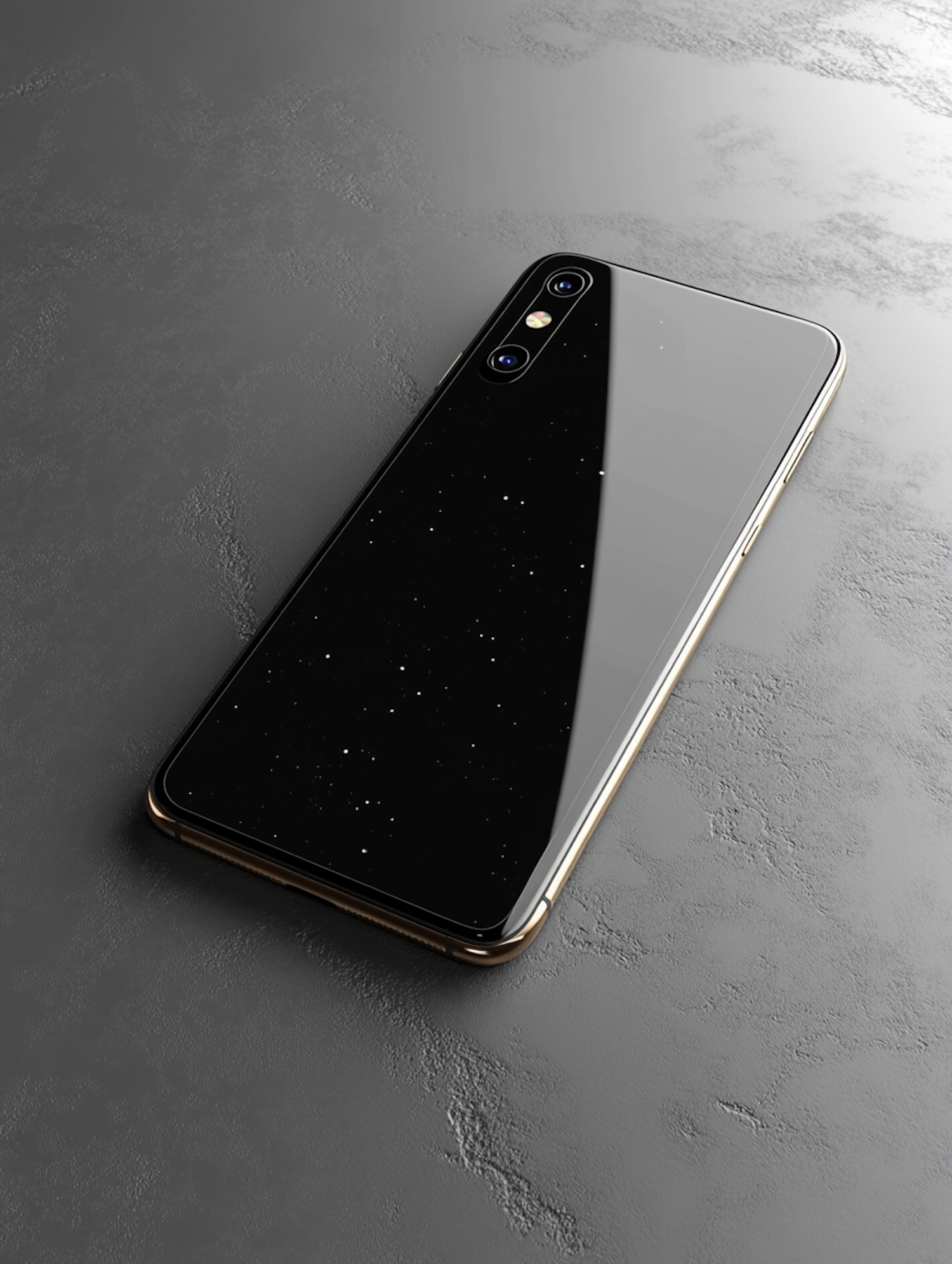 Sleek black smartphone with a starry night design, dual cameras, and gold edges resting on a textured matte surface.